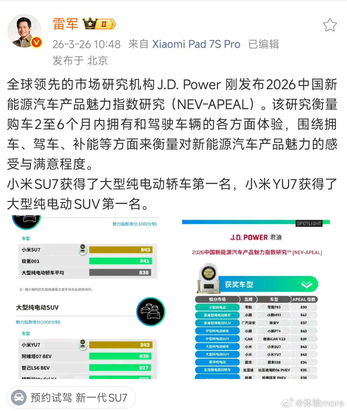雷军回应小米双车登顶JDPower魅力榜J.D.POWER刚发布的2026中国新能源汽车产品魅力指数研究,小米SU7获大型纯电动轿车第一名,小米YU7获大型纯电动SUV第一名。该研究有21512名受访者参与评价,含金量还是很高的。