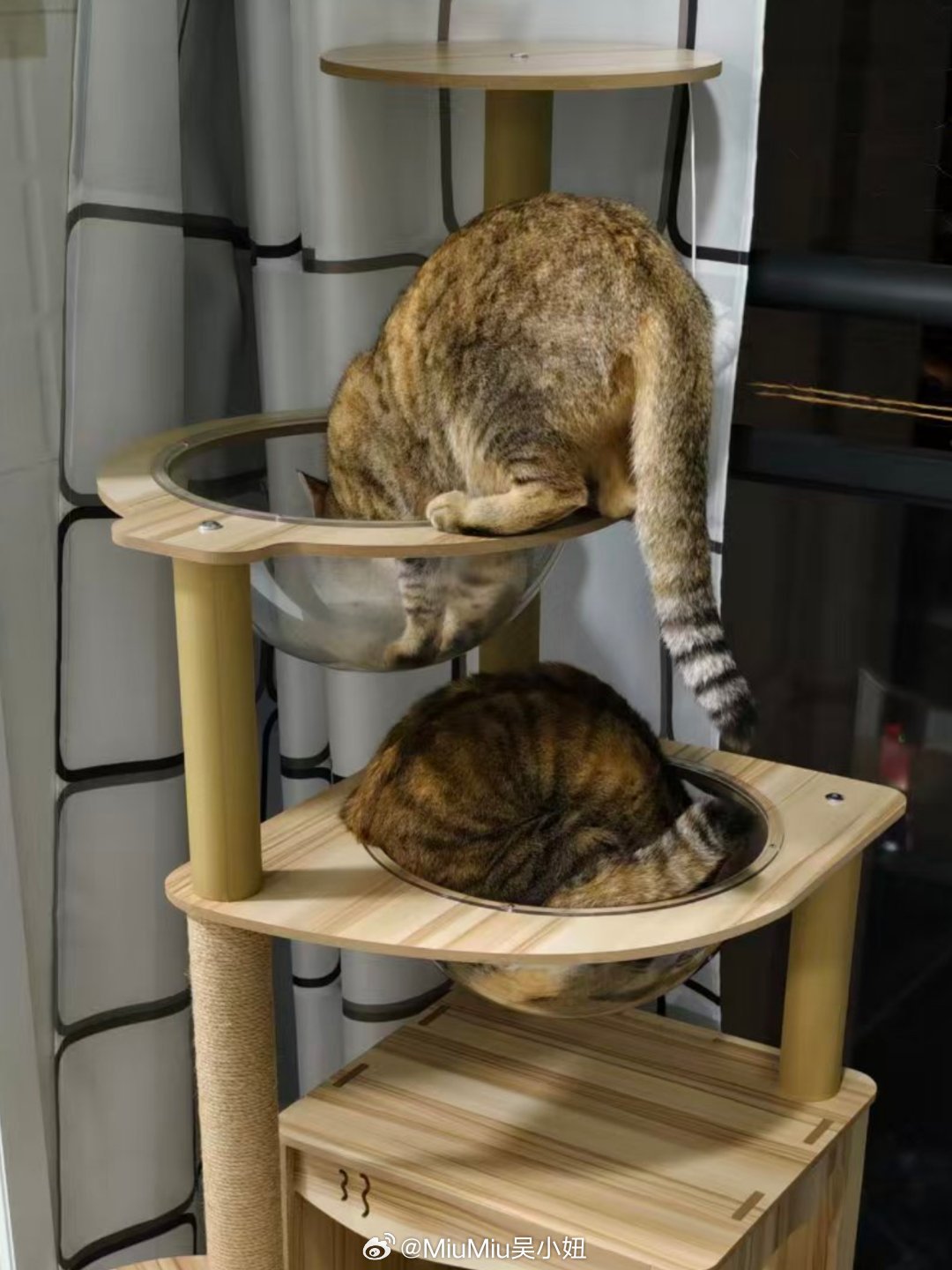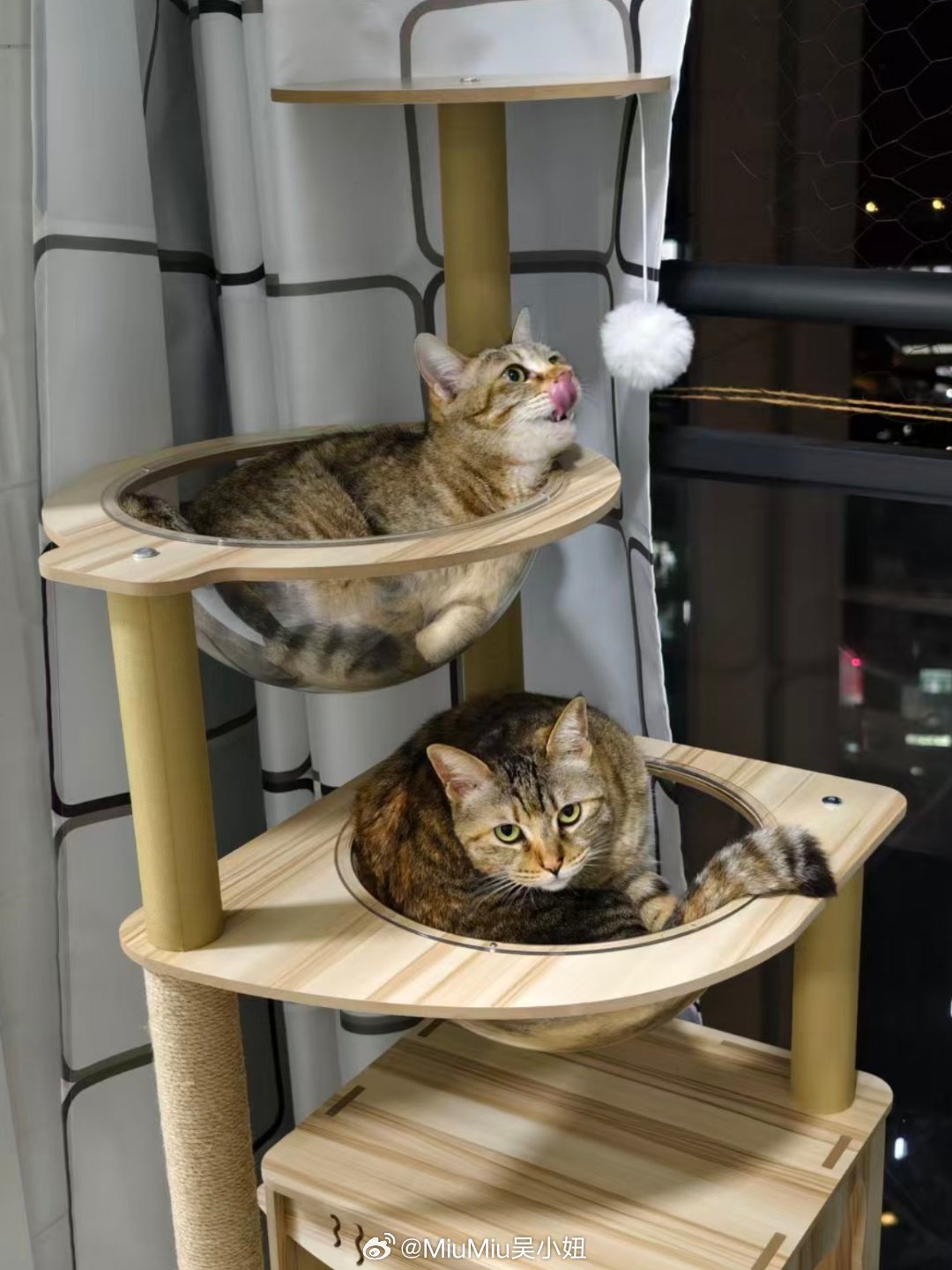两只咪也已经五岁啦~~以前一个架子只有一个太空舱,总是被大肥霸占~她爹给组装了个新架子~一转眼的功夫就各归各巢啦~!都说猫猫之间也有等级区分~级别高的猫喜欢站在高处~所以能看出她俩之间的地位之别不