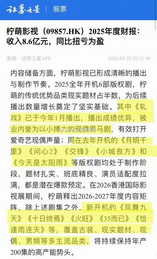 柠萌2025年财报,陈星旭《你也有今天》《轧戏》两部柠萌现偶都上财报表彰,提到成