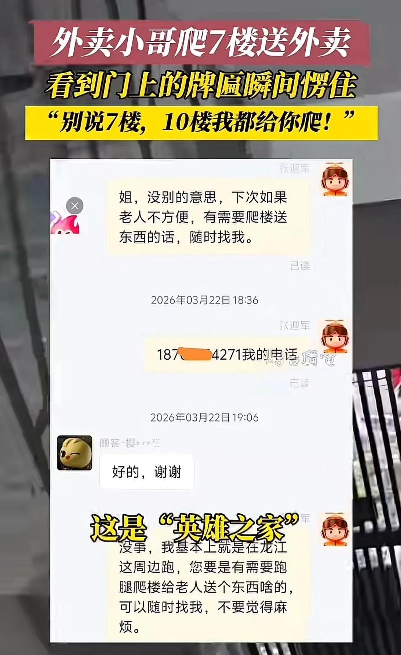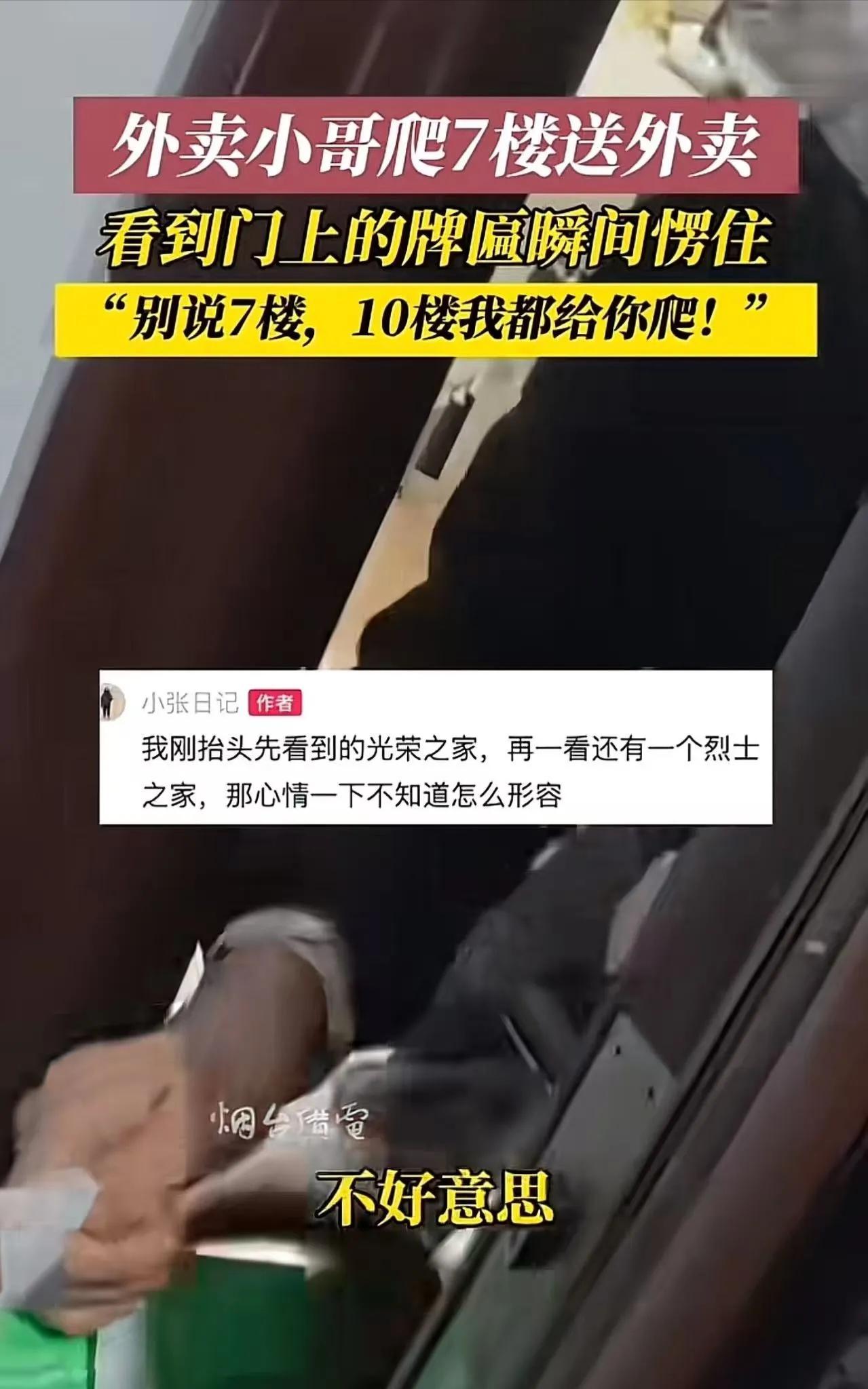 “外卖小哥爬七楼送外卖,心里正不爽,看到门口牌匾瞬间红了眼眶!”网友:这牌匾是荣誉,更是心酸 内容摘要: 外卖小哥大刘接了一单7楼的外卖,老破小没电梯,爬楼爬得满肚子火。结果到门口一看,门上挂着两块牌匾——一块“光荣之家”,一块“烈士之家”。小哥瞬间破防,所有怨气都没了。送完餐后,他主动给老人的女儿发短信:以后老人需要啥,免费送,不要钱!网友泪目:“英雄为国捐躯,咱们帮英雄的父母爬个楼,算啥?”今天咱们聊聊,烈属在法律上有哪些优待?社会和企业又该为他们做些什么? --- 一、爬七楼满肚子火,看到“烈士之家”瞬间破防 那天中午,外卖小哥大刘接了一单,地址是老小区的7楼。没电梯,楼梯又窄又暗。他提着餐盒往上爬,心里直嘟囔:“住这种地方,就不能自己下来拿吗?” 好不容易爬到7楼,一抬头,愣住了。 门框上挂着两块牌匾。一块红底金字,写着“光荣之家”。旁边那一块,赫然写着四个大字——“烈士之家”。 大刘觉得嗓子眼像被什么东西堵住了。所有怨气,在这一刻全没了。 门开了,一位满头银发的老人探出头,满脸歉意:“小伙子,真对不住,我这腿脚不行……” 大刘双手把餐递过去:“老人家,您客气啥!能给您送东西,是我的荣幸。” 下楼后,他给老人的女儿发了条短信:“姐,以后老人需要啥重物,您直接给我打电话,我免费送,不要钱!咱不能让烈士的家人受委屈。” 他把这事发到网上,配文写着:“老人的儿子把命交给了国家,咱们帮老人爬个楼,算个啥?”视频一发,网友全哭了。 --- 二、法律分析:烈属的优待,不只是“靠善心” 大刘的善心很暖,但烈属不该只靠“善心”活着。国家法律对烈属到底有哪些保障? 1. 烈属享有哪些法定优待? 根据《军人抚恤优待条例》,烈属依法享受多项优待:一次性抚恤金和定期抚恤金;公立医院优先挂号、就诊;保障性住房优先安排;公办养老机构优先入住并减免费用;公交地铁优先优惠。 这些政策写得明明白白,但现实是,很多烈属并不清楚自己有哪些权利,有些地方落实得也不够到位。 2. 烈属的困境,政策能兜底吗? 像这位老人,她的困境不是“没钱”,而是“没人”。腿脚不好、家住7楼没电梯、子女不在身边——这种日常生活中的“不方便”,靠政策很难完全覆盖,需要社会力量的补充。 外卖平台能不能在系统里标注“烈属家庭”,优先派单、免收跑腿费?这不只是“做好事”,也是企业的社会责任。《退役军人保障法》鼓励企业为军属、烈属提供优待服务。 --- 三、别让英雄的父母在后方寒了心 大刘的举动为什么能感动这么多人?因为他的反应是“本能”的——你护国,我护家。这种自发的敬畏,比任何强制政策都来得真实。 但我们也得想:如果那天送餐的不是大刘,是一个没注意到牌匾的小哥呢?如果老人点的是米面,小哥爬七楼累得够呛,会不会也有怨气? 英雄为国捐躯,留下的父母,不该在晚年还要为“爬楼”这种小事发愁,更不该把希望寄托在“遇到好心人”上。 最好的状态是:政策兜底,社会补充,人人都能“看见”英雄背后的付出。 --- 结论:这牌匾是荣誉,更是心酸 “光荣之家”四个字,是荣誉;“烈士之家”四个字,是荣誉,更是心酸。 当年轻的生命化作丰碑,留给父母的,是余生漫长的孤寂和无助。大刘的举动之所以动人,不是因为他多伟大,而是因为他做了一个普通人最该做的本能反应。 别让英雄在前方挡子弹,却让他们的父母在后方寒了心。这,是我们欠他们的,必须还。 --- 最后,想问问大家: 你身边有烈属家庭吗?你觉得外卖平台应该为烈属提供什么样的特殊服务?欢迎在评论区聊聊你的想法。 来源: 综合自网络视频、网友分享