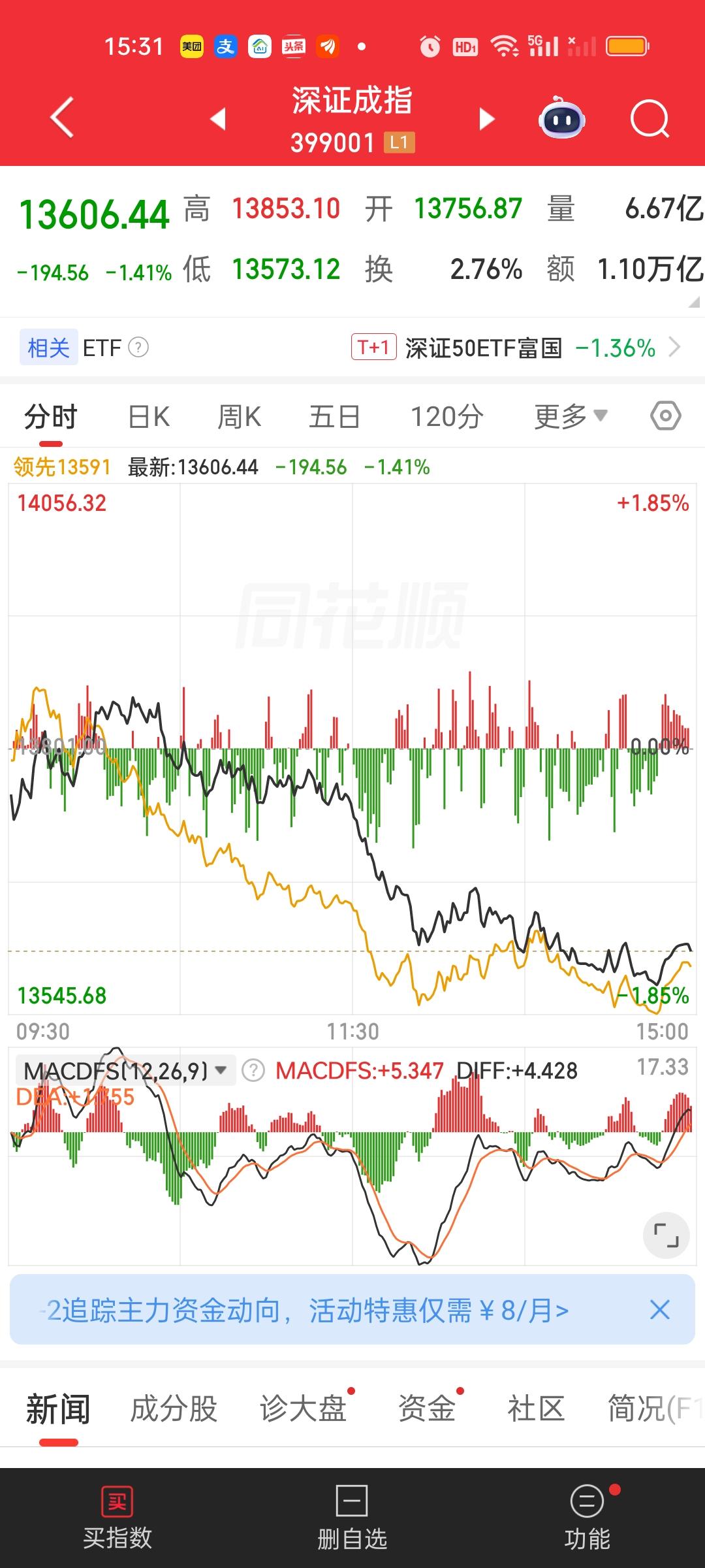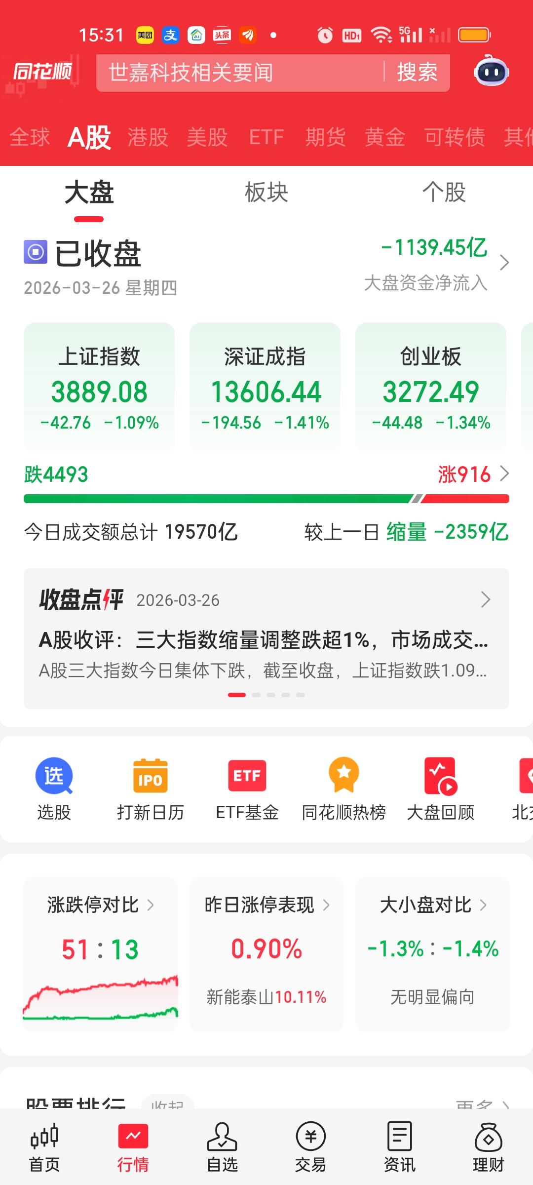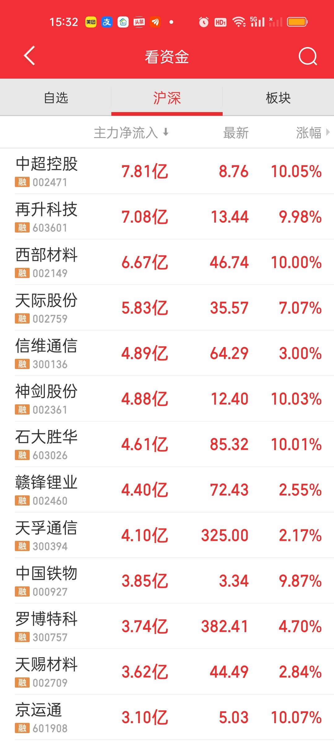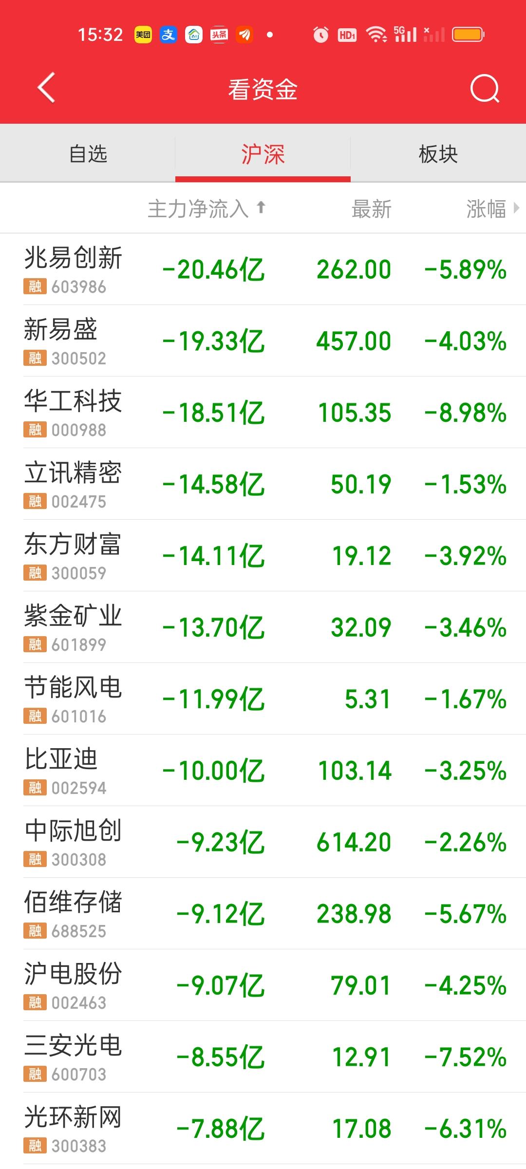 收盘了,下午成交量还放了2420-2359=61亿。但下跌家数增加了380家,合计共有4493家下跌,有13家跌停。上午收盘大盘资金净流出594.49亿,全天收盘净流出1139.45亿,1139.45-594.49=544.96亿。这说明下午净流出了545亿。上午和下午净流出的资金基本相当。 今天没有资金净流入超10亿的个股。但净流出资金超10亿的个股有不少。上午只有兆易创新一家,下午增加了新易盛,华工科技,立讯精密,东方财富,紫金矿业,节能风电,比亚迪。增加了7家。