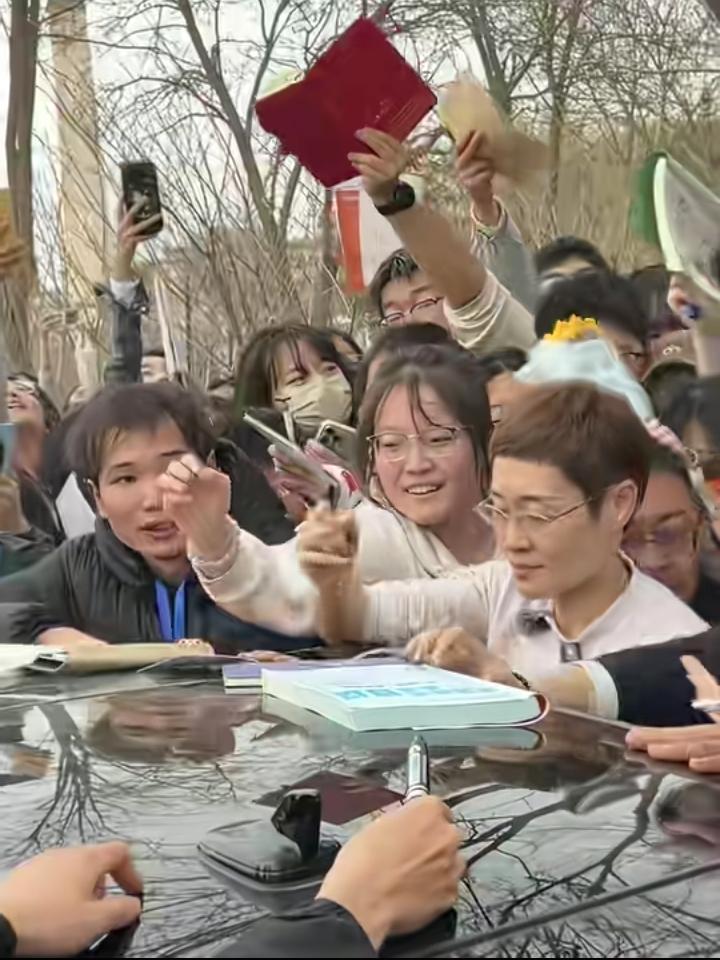 张雪峰,刘晓燕这两位老师为啥能火到学生挤破头?看完这两张图,你就懂了。 一边是刘晓燕被学生围得水泄不通,大家举着本子,手机追着要签名,她耐心又温柔,一点架子都没有。另一边是张雪峰蹲在台上,对着满场学生竖大拇指,笑得实在又接地气,台下密密麻麻全是人。 刘晓燕老师,一个讲课全是干货,不玩虚的,像知心姐姐一样,讲的个人经历都说到学生心坎里了,不仅心灵被治愈了,还学到了知识。 张雪峰老师,他说话虽然直来直去的,但是全是大实话,帮助了不少学生,让他们少走了很多弯路。 两位老师风格不一样,但他们都有一个共同点:真诚。现在的学生不傻,谁真心对他们好,他们心里最清楚,能遇到这样的老师,真的是一种幸运。