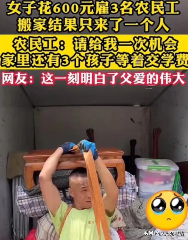 看哭了!近日看到一则新闻,因为搬家公司收费太高,一女子花600 元雇 3 名农民工搬家,结果对方只来了一个人!女子气坏了,觉得农民工欺骗自己,可没想到农民工说:“请给我一次机会,我家里还有 3 个孩子等着交学费!”网友:这一刻明白了父亲的伟大![太阳] 22年,李女士对比了几家搬家公司,报价普遍在一千到两千元之间,于是她最终联系了三位农民工,谈定600元搬完全部家当。 可搬家当天只出现了一个人,李女士当场就想取消。 一个人,600元,这笔账怎么算都不对,她把这个意思直说了出来。 那位农民工没有多辩解,只说了一句,家里三个孩子的学费还没着落,希望给他一个机会。 所以她让他留了下来,后者从早到晚没有坐下来喝过一口水,布带绕过家具捆紧背起来,一步一步走楼梯。 衣服湿了干,干了又湿,柜角碰到墙边他用手护着,没有一件磕坏,到傍晚所有东西搬完,摆放得整整齐齐。 李女士数出1000元递过去,比原定价格多出400元,她说多的那些算是给孩子的,他推了两次这才收下了。 这件事之所以流传开来,不是因为故事有多曲折,而是因为它太真实,一个父亲在城市里能做的,就是用力气换钱,然后把钱带回家。 在许多建筑工地和搬运市场,你随便问一个工人,他兜里的钱大半是要汇出去的,孩子的学费、父母的医药费、盖房子的材料款,这些账他们记得比谁都清楚。 李女士没有做什么了不起的事,只是多付了400元,并且告诉了对方原因,这个原因让那400元有了重量。 有个网友留言特别实在,他说:“我爸当年也是这样,在工地上什么活儿都干,肩膀上永远有一道道勒痕。他总说自己力气大,没事,其实都是硬扛。这哪是力气大,这是心劲儿大,为了孩子,什么苦都能咽下去。” 说真的,最开始说好三个人来一个,放谁身上都得上火,但李女士能听进去那句孩子要交学费,能让他试试,最后还多给了钱,这就是善良遇到了感恩。 这大姐能处,心眼是真好,这钱给得值,暖了两边人的心。 不过也有人表示:“感动归感动,但说实话,一个人干三个人的活,还是搬重物上下楼,这太危险了,对身体损耗极大。这次是没出事,万一腰闪了或者摔了,后续的麻烦和费用可能远远不止这600块。这种重体力活,该几个人干就得几个人干,不能光凭一口气硬撑,安全永远是第一位的。” 那么,想问问大家,如果你在生活中遇到类似的情况,比如对方因实际困难无法完全履行约定,你会更倾向于坚持原则按约定处理,还是愿意像李女士这样,基于对方的具体难处,给予一次通融和机会呢?你觉得在原则与人情之间,该如何权衡?