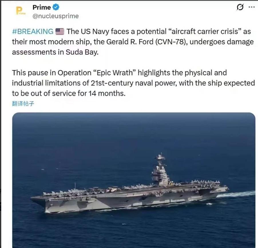 特朗普希望破灭了,但是福特号航母上4500名美军士兵却彻底安全了,据最新消息,已经抵达希腊港口的福特号航母需要进行14个月的维修才能重新服役部署!3月23日,福特号航母缓缓驶入希腊苏达湾海军基地。 说起来这事挺有意思,这艘号称全球最贵、最先进的核动力航母,造价130亿美元,顶得上一个小国全年GDP,结果却栽在了一场洗衣房大火上。 3月12日那场火可真不含糊,足足烧了30多个小时,浓烟把200多名水兵呛得够呛,还有3人直接受伤,船上好多舱室和床位都成了黑炭。 美军一开始还嘴硬说推进系统没受损,航母能正常运作,结果没撑几天就灰溜溜开到希腊修船,这脸打得可真响。 更让美军头疼的是,这14个月可不是随便说说的,美国军事专家早就戳破了真相。福特号从去年6月就出来晃悠,到现在快10个月了,远超6个月的标准部署周期,各种毛病早就攒了一箩筐。 就说那650个厕所,几乎天天堵,水兵上趟厕所得排45分钟队,近九成厕所都瘫痪了,这哪是海上霸主,简直是海上公共厕所维修站。 还有那套吹得神乎其神的电磁弹射器和阻拦装置,动不动就罢工,飞行员每次起飞都得捏把汗,生怕被这高科技坑了。 这14个月的维修期意味着什么?意味着特朗普想用福特号在中东搞事的算盘彻底落空了。 本来他还指望这艘航母在伊朗问题上秀肌肉,给以色列撑腰,结果现在倒好,航母直接趴窝,美军在中东的威慑力瞬间减半。 更搞笑的是,美军原本计划让福特号和林肯号在中东搞双航母编队,现在一个要大修,另一个也独木难支,这全球部署的牛皮可算吹破了。 不过话说回来,对船上那4500名美军来说,这14个月的维修期简直是天降福音。想想看,天天在海上漂着,厕所堵得没法用,洗衣房烧得没法洗衣服,电磁弹射器说不定哪天就出幺蛾子,这种日子谁受得了?现在好了,终于能上岸歇歇,不用再提心吊胆,也不用跟那些老出故障的设备较劲了。 虽然美军说靠岸后不让水兵下船,要搞什么隔离审查,但总比在海上担惊受怕强吧。 有人算了笔账,福特号这次部署10个月,维修就要14个月,这哪是战斗舰艇,分明是个需要长期疗养的病号。 以前美军航母都是六个月部署六个月维护,战斗和休整一比一,现在倒好,修的时间比用的还长,这效率也是没谁了。难怪有网友调侃,美军这哪是全球部署,简直是全球“养病”,这14个月够中国造半艘航母了。 最打脸的是,这艘航母当初吹得有多狠,现在就有多狼狈。什么划时代技术、无人能敌的战斗力,结果连个洗衣房都管不好,一场大火就暴露了所有短板。这也给各国提了个醒,武器装备不是越贵越好,实用性才是王道,不然再先进的东西,也不过是个中看不中用的绣花枕头。 现在福特号就静静停在希腊港口,等着被拖回美国本土大修。这14个月里,中东局势还不知道会怎么变,等它修好了,说不定早就不是它熟悉的那个战场了。