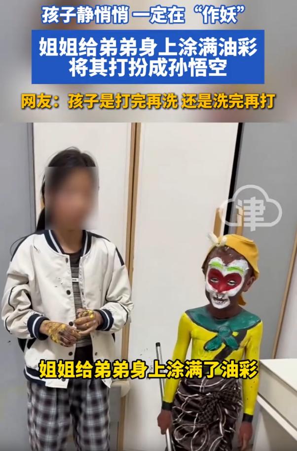 笑不活了!山东,一位妈妈下班回到家,发现家里两个孩子静悄悄的,等进屋一看,发现姐姐竟然把油彩涂到了弟弟身上,把他装扮成孙悟空的模样,而且像模像样,但看到一地的涂料,妈妈却瞬间上头了:小孩静悄悄,一定在“作妖” 当天妈妈回到家,推开门,家里静悄悄的。两个孩子,一个七岁,一个四岁,平常这个点早就闹翻天了,今天居然一点动静都没有。这位妈妈当时就觉得不太对劲 果然,走进客厅一看,场面直接让她血压拉满 地上全是油彩,红的黄的绿的,瓷砖都快看不出原来的颜色了。再往旁边一看,弟弟浑身上下被涂得满满当当,活脱脱一个孙悟空。金黄的衣服、虎皮围裙、甚至连额头上都被画上了紧箍咒,愣是整出了一套完整的猴王行头 而姐姐正拿着画笔,认认真真地给弟弟最后收尾,一脸得意,丝毫不觉得有什么问题 妈妈看到后也是哭笑不得,开玩笑询问网友:孩子是打完再洗,还是洗完再打 有网友表示:人才啊,这大闹天宫的扮相。完美还原cosplay 还有网友说:姐姐是老天爷赏的化妆师 这话说得确实没毛病。七岁的孩子能把孙悟空的形象还原到这个程度,说明她是真的仔细观察过、认真琢磨过的。不是随便乱涂,而是在做一件自己觉得特别有成就感的事 其实很多家长都有过类似的经历。回家发现墙上被画满了,面粉撒了一地,或者所有玩具都被拆得七零八落。第一反应永远是火冒三丈,但过了那个劲儿再回头看,又觉得又气又好笑 孩子就是这样长大的。没有哪个孩子从小到大没闯过祸,没把家里折腾得乱七八糟过。这些在大人眼里的灾难现场,在他们心里就是最快乐的童年