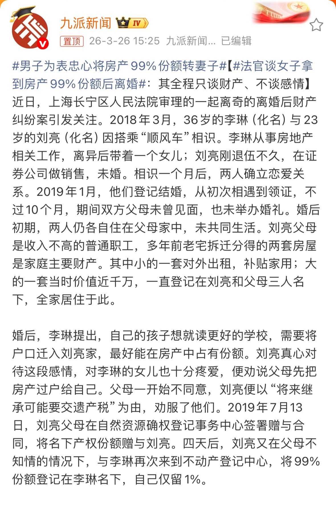 男子为表忠心将房产99%份额转妻子省流:二婚女子要求加名(占比99%)同居半年之后离婚,最后给了50万补偿。