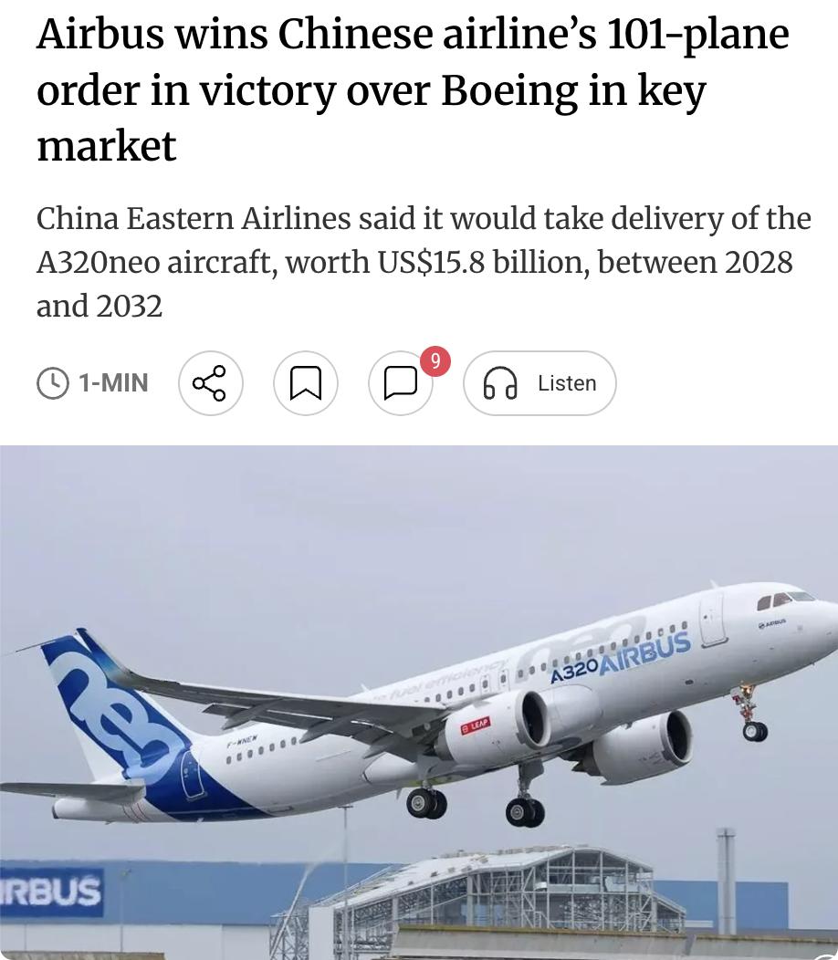 外媒:空客赢得中国东方航空101架A320neo飞机订单,目录价158亿美元,实际获大幅折扣,交付期为2028至2032年,此次交易将扩大东航窄体机队规模并降低燃油成本。 这是空客继去年12月斩获中国航企148架订单后的又一胜利,而竞争对手波音此前盛传可能达成的对华交易至今仍未落实。