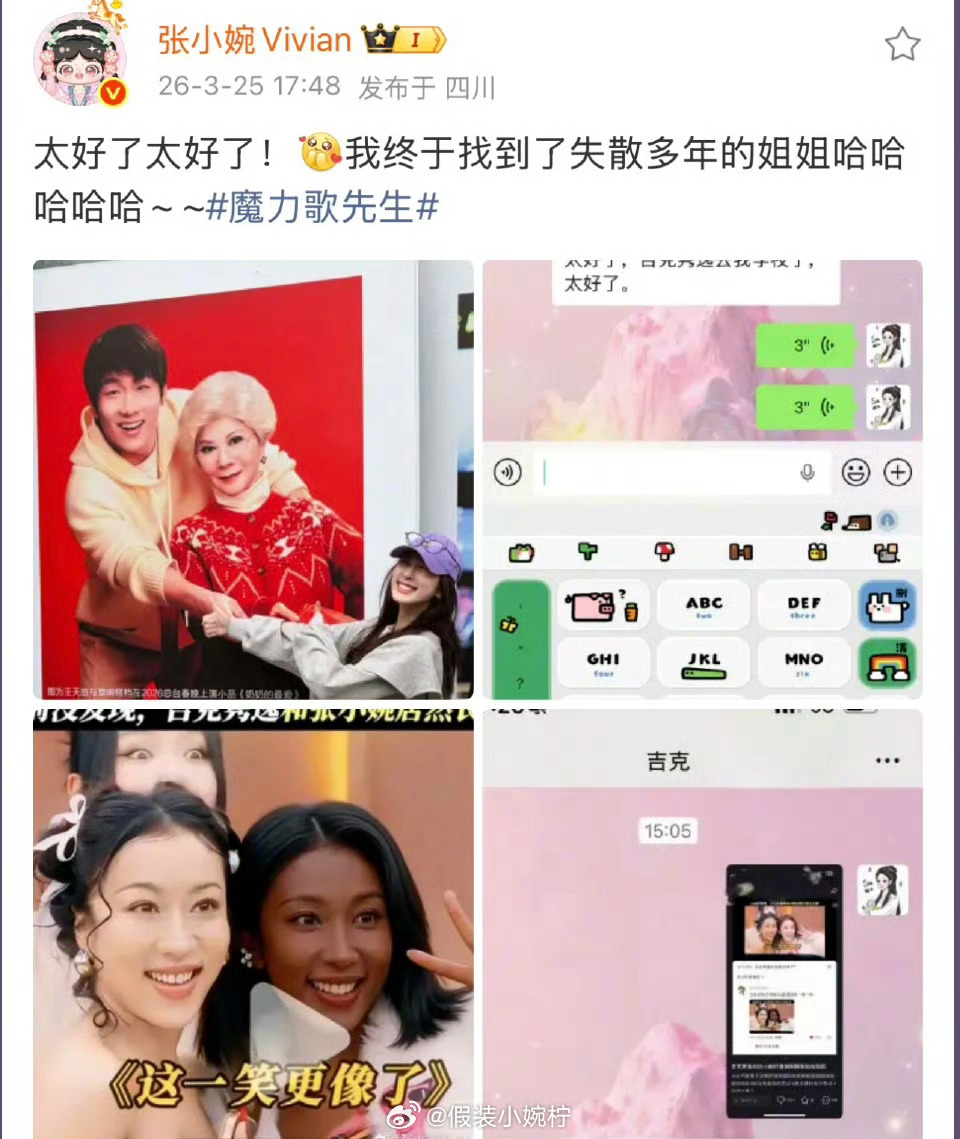 吉克隽逸张小婉共用一张脸张小婉通过微博幽默发文称"终于找到失散多年的姐姐",并直接点名吉克隽逸,配图展示两人相似笑容。该互动源于共同参与的综艺《魔力歌先生》,录制中双方发现彼此笑容神态神似,张小婉顺势以"寻亲"梗制造节目效果,吉克隽逸也在评论区积极回应,两人因此互加联系方式。