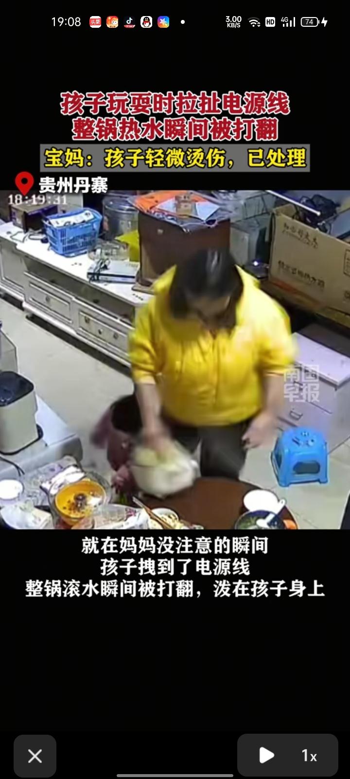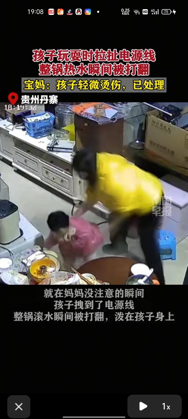 3月24日,黔东南州丹寨县。宝妈在店里用电锅煮面条时,孩子在一旁玩耍。趁宝妈没注意,孩子拽到了电源线,整锅滚水瞬间被打翻,泼到孩子身上。 孩子妈妈称,宝宝一岁半,轻微烫伤,已经涂了药