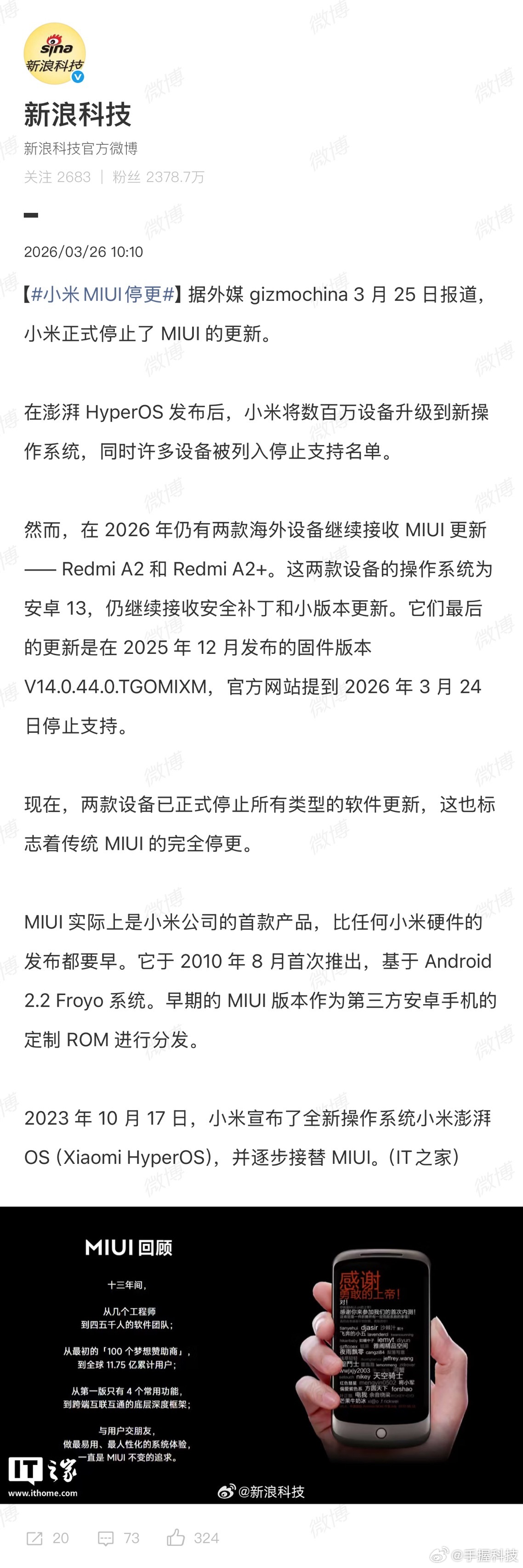 刷到小米MIUI停更,心里五味杂陈!我是从米2的MIUI一路用到小米13 Ultra的澎湃OS,这么多年下来,几乎见证了小米整个成长轨迹。一晃快十三年过去了,从一部小手机到如今整个人车家全生态,就这么一路走过来了。也看到热搜上不少老米粉还在惦记MIUI,特别有共鸣。它不只是一个系统,更像一段青春,一段用惯了就舍不得换掉的习惯。不过这次正式交棒给澎湃OS,心里有不舍,也有期待。官方也说了,会继续保障必要的安全补丁,算是给老用户一个温柔的收尾。技术总在迭代,能亲眼见证这样的传承,其实挺幸运的。希望小米未来越来越好,系统越用越顺,不负这么多年老用户的一路追随。