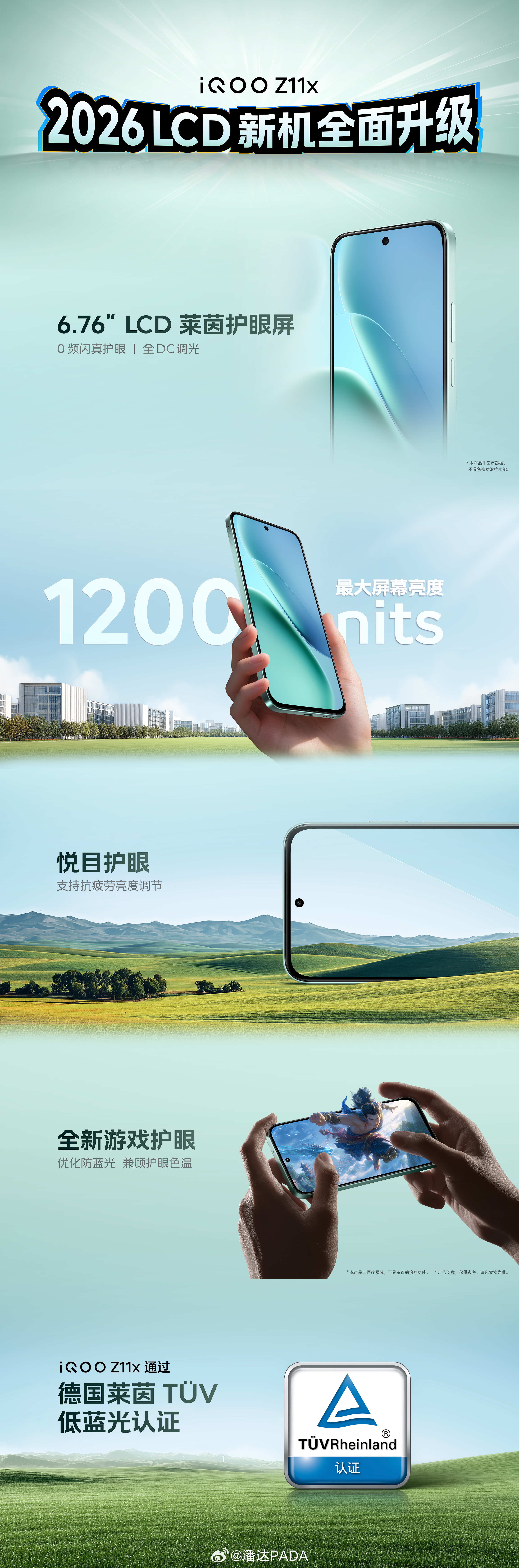 iQOO Z11x提供冰青绿、雪屿白、夜影黑,采用大R角设计,外观更优雅。配备6.76英寸护眼LCD屏,支持DC调光和1200nits高亮度,户外可视性强。软件方面升级悦目护眼和游戏护眼功能,通过德国莱茵低蓝光认证,有效减少视觉疲劳。