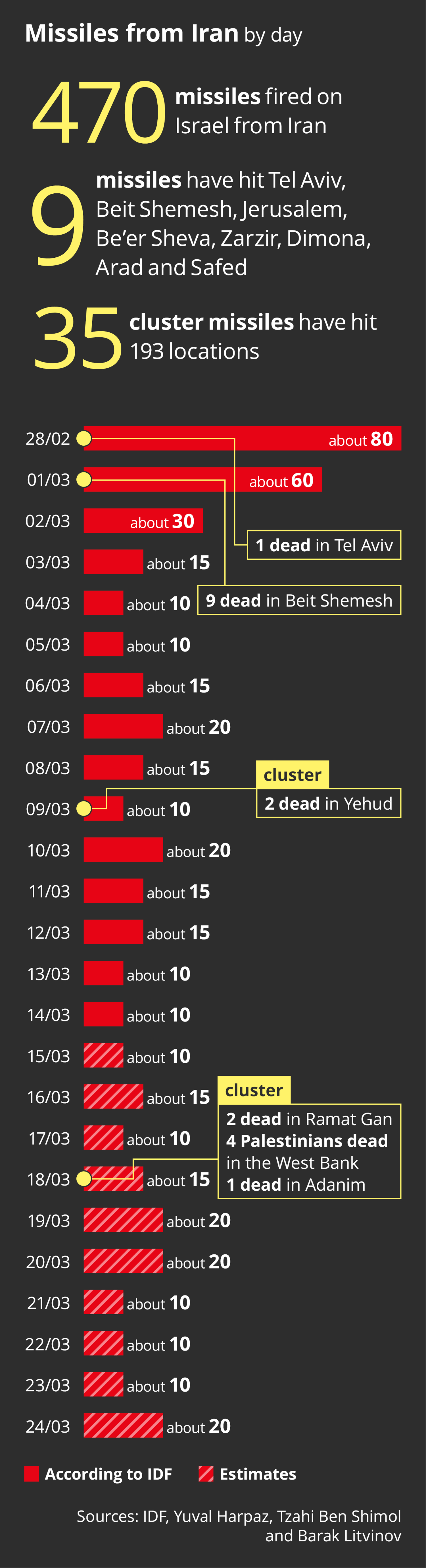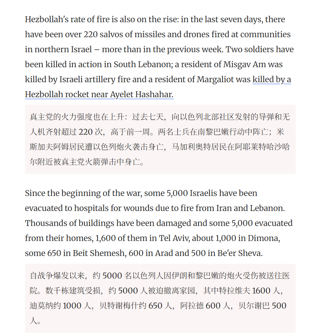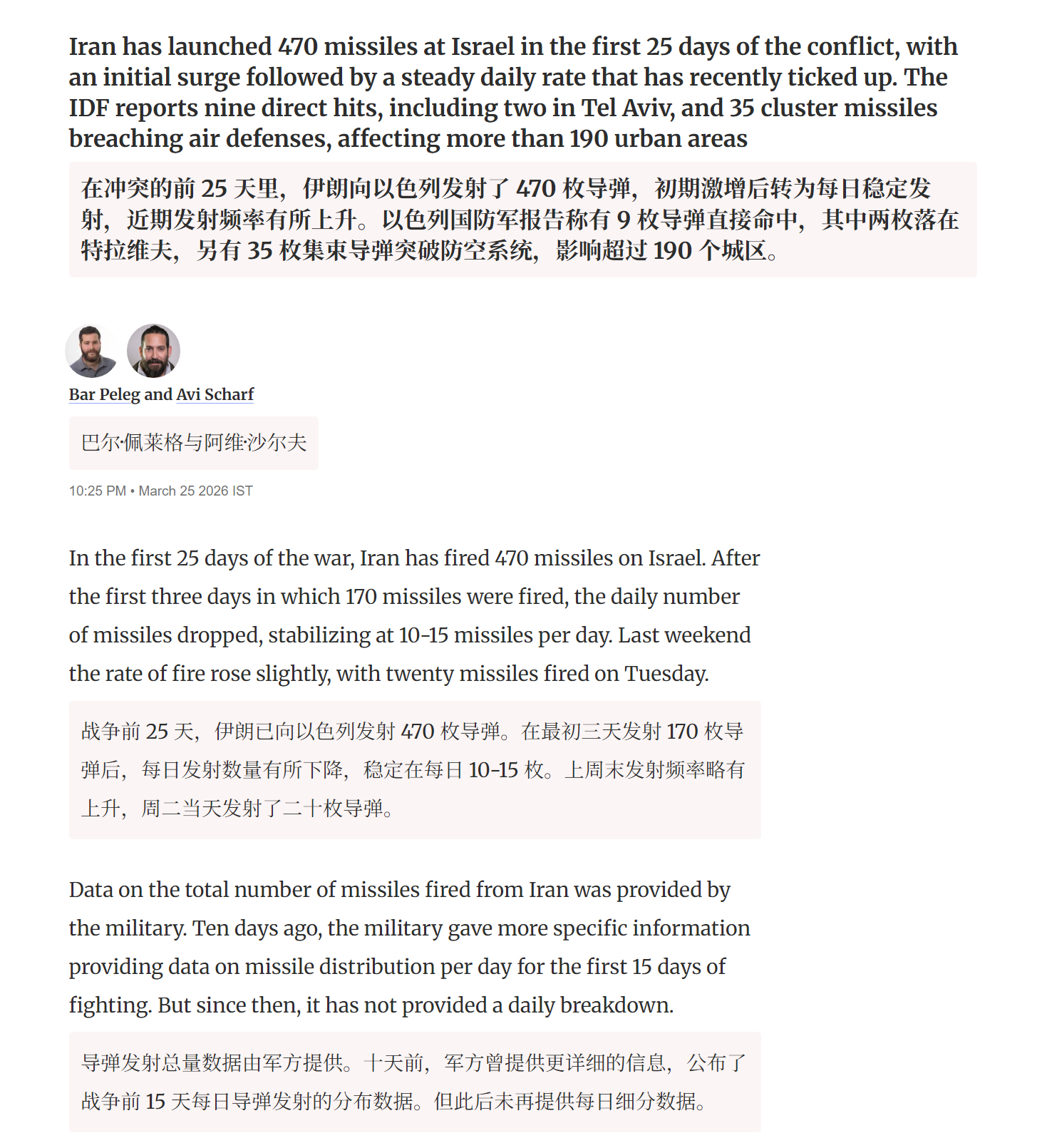 🔻以色列非国民媒体国土报说:在冲突的前 25 天里,伊朗向以色列发射了 470 枚导弹,初期激增后转为每日稳定发射,近期发射频率有所上升。🔻真主党的火力强度也在上升:过去七天,向以色列北部社区发射的导弹和无人机齐射超过 220 次,高于前一周。两名士兵在南黎巴嫩行动中阵亡;米斯加夫阿姆居民遭以色列炮火袭击身亡,马加利奥特居民在阿耶莱特哈沙哈尔附近被真主党火箭弹击中身亡。🔻自战争爆发以来,约 5000 名以色列人因伊朗和黎巴嫩的炮火受伤被送往医院。数千栋建筑受损,约 5000 人被迫撤离家园,其中特拉维夫 1600 人,迪莫纳约 1000 人,贝特谢梅什约 650 人,阿拉德 600 人,贝尔谢巴 500 人。伊朗伊斯兰革命卫队海军指挥官身亡伊朗对美以发动82波打击海外新鲜事中东现场直击