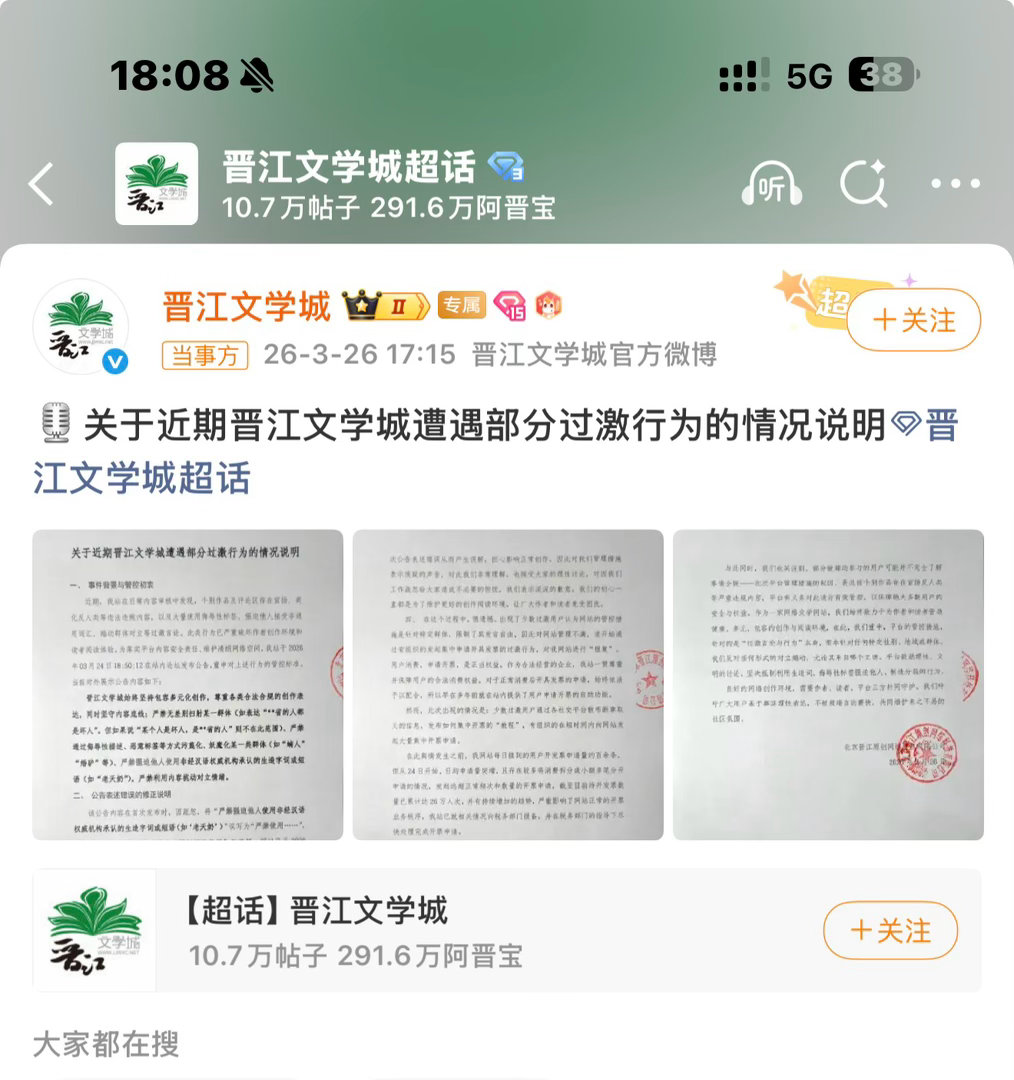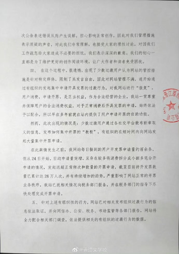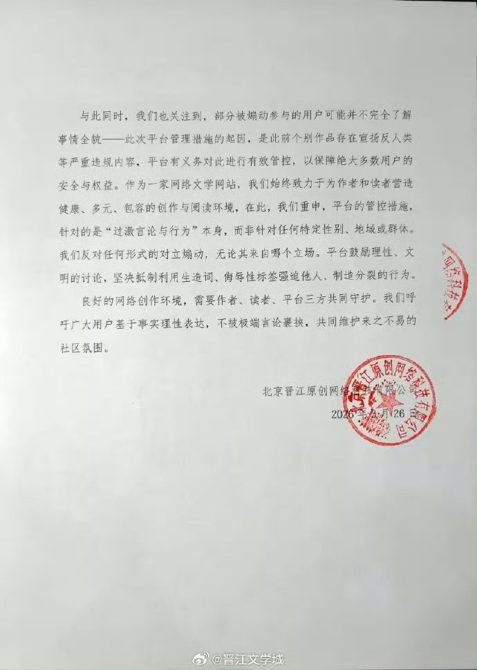晋江发情况说明晋江文学城将小说《女主对此感到厌烦》临时锁文,并以“严禁使用非经汉