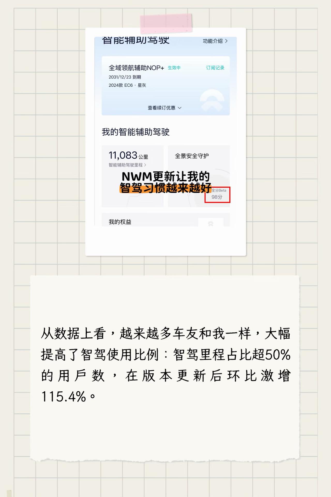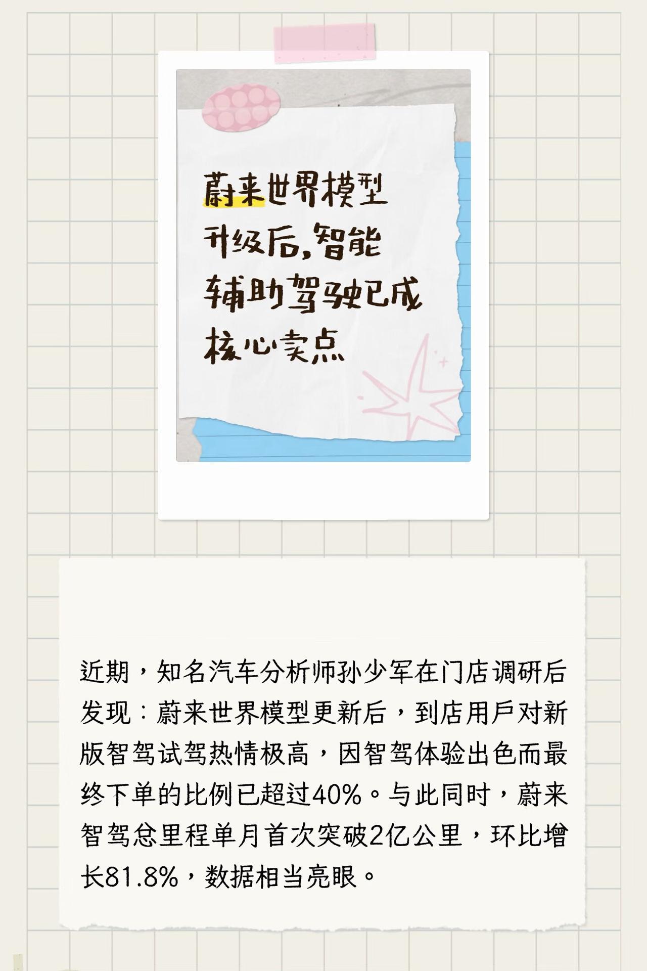 蔚来世界模型升级后,智能辅助驾驶已成核心卖点 在2025年5月30日蔚来世界模型首版全量推送之前,恐怕没人能想到,短短不到一年,蔚来的智能辅助驾驶竟已成为实实在在的购车卖点。即便2025下半年争议不断,但今年一月底世界模型第二版推送后,蔚来智驾直接迎来质变,彻底“起飞”。 近期,知名汽车分析师孙少军在门店调研后发现:蔚来世界模型更新后,到店用户对新版智驾试驾热情极高,因智驾体验出色而最终下单的比例已超过40%。与此同时,蔚来智驾总里程单月首次突破2亿公里,环比增长81.8%,数据相当亮眼。 作为一名从油车换到蔚来EC6的普通车主,我深有体会。换车后自驾本就变多,世界模型迭代后更是出门不断,这一切都离不开智能辅助驾驶的加持。现在上下班通勤的“痛苦指数”直线下降,哪怕是雨天、夜晚视线差,我也更愿意、也更放心地交给智驾。目前我的智驾里程占比已接近80%,驾驶习惯也越来越好,智驾分稳定在98分,人机共驾越来越默契。 从数据上看,越来越多车友和我一样,大幅提高了智驾使用比例:智驾里程占比超50%的用户数,在版本更新后环比激增115.4%。 不得不说,蔚来这次世界模型的升级非常成功。期待后续持续优化,也希望老车主都能一直享受到科技带来的安心与便利。蔚来 蔚来智驾 蔚来世界模型