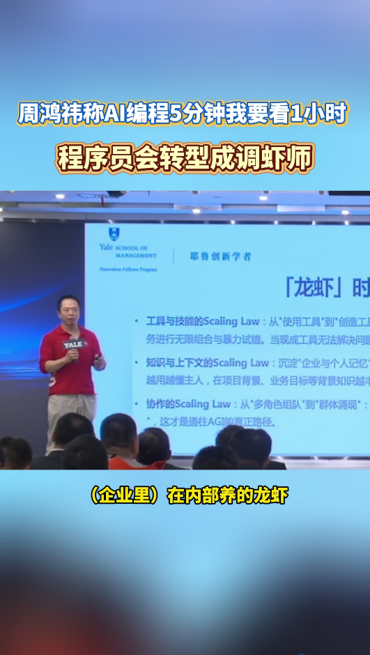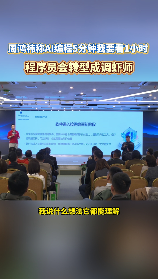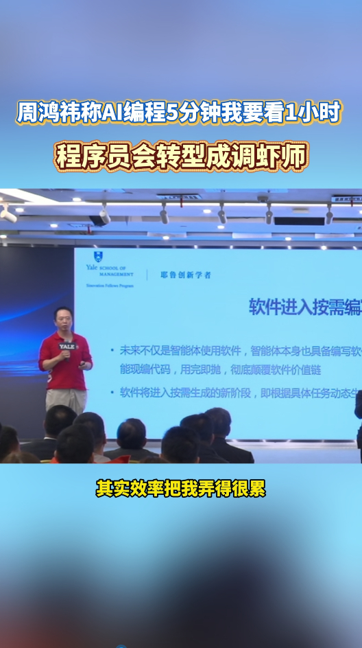 周鸿祎称AI编程5分钟我要看1小时AI编程两极分化,高效时秒出大量代码,失误时直接删改版本。别迷信AI,未来核心竞争力是指挥AI,而非被工具替代。周鸿祎称程序员会转型成调虾师