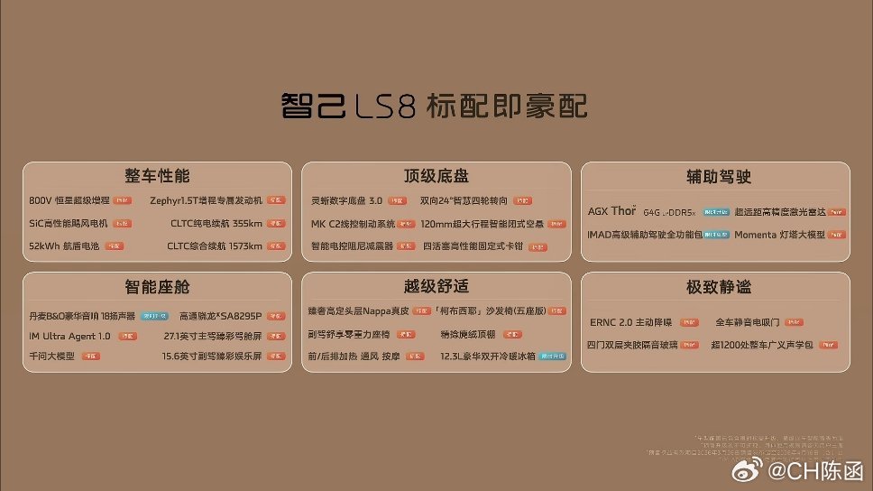 智己LS8把价格打到了25.98万!主打的是大5座版,6座+2万。标配空悬、后轮转向、四活塞卡钳、B&O音箱、副驾电影屏、副驾零重力座椅等一大堆配置。全线控转向+10000元,全系可选妥妥打进30万以内!这个价格确实远低于预期!