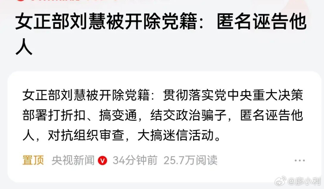 刘慧严重违纪违法被开除党籍搞权钱交易、结交政治骗子,匿名诬告他人,对抗组织审查,