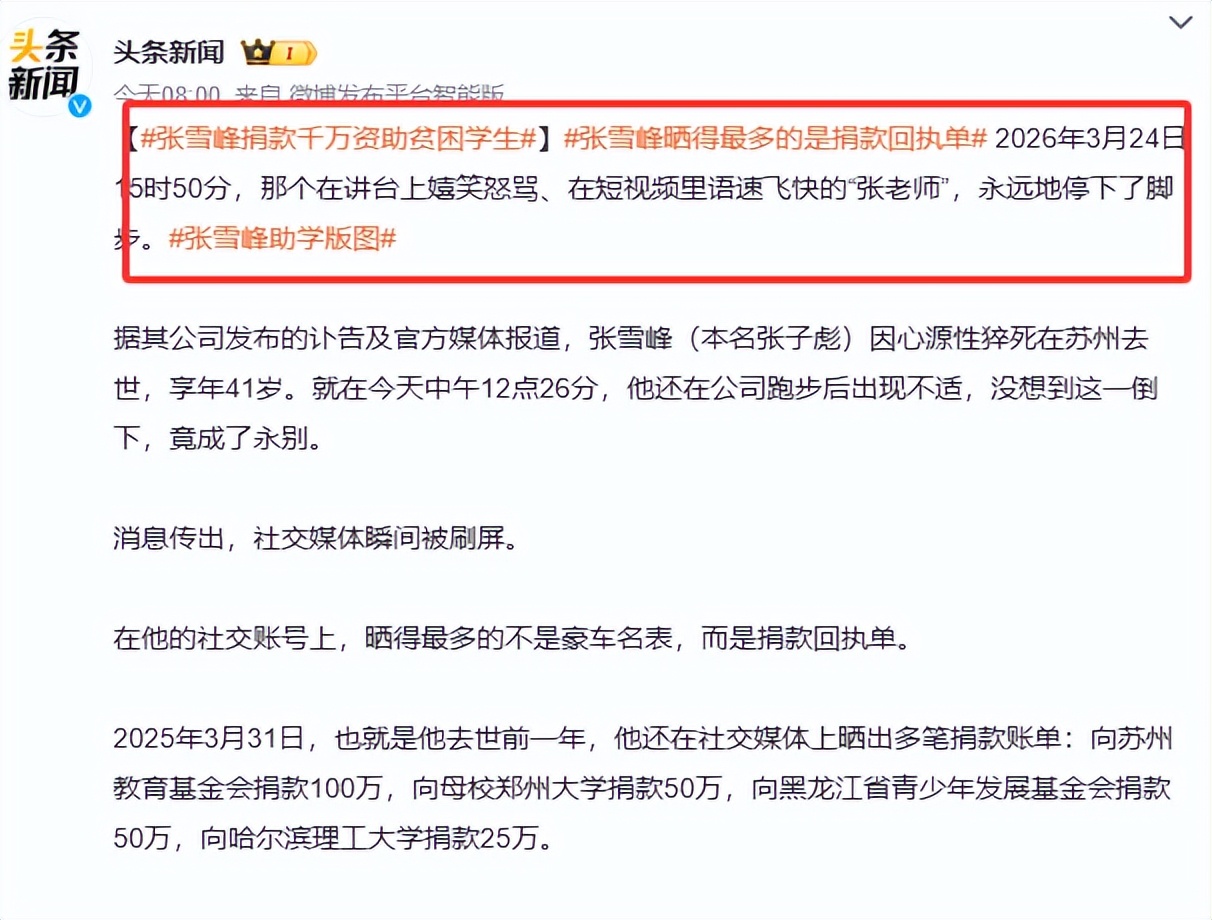 穷人家的孩子发达之后的善举,看看张雪峰,看看刘强东,哪个是富二代官二代 只有底层走出去的孩子才知道底层人的不容易,希望以后有更多底层的孩子走出去! 原来不懂张老师。总以为他作为名人不该说脏话,现在才理解。名人不是完人。 他是真性情真豪迈!他是一座灯塔。照亮了无数考生未来的路。可惜他走的太早了,真的是太年轻了!张雪峰老师一路走好!
