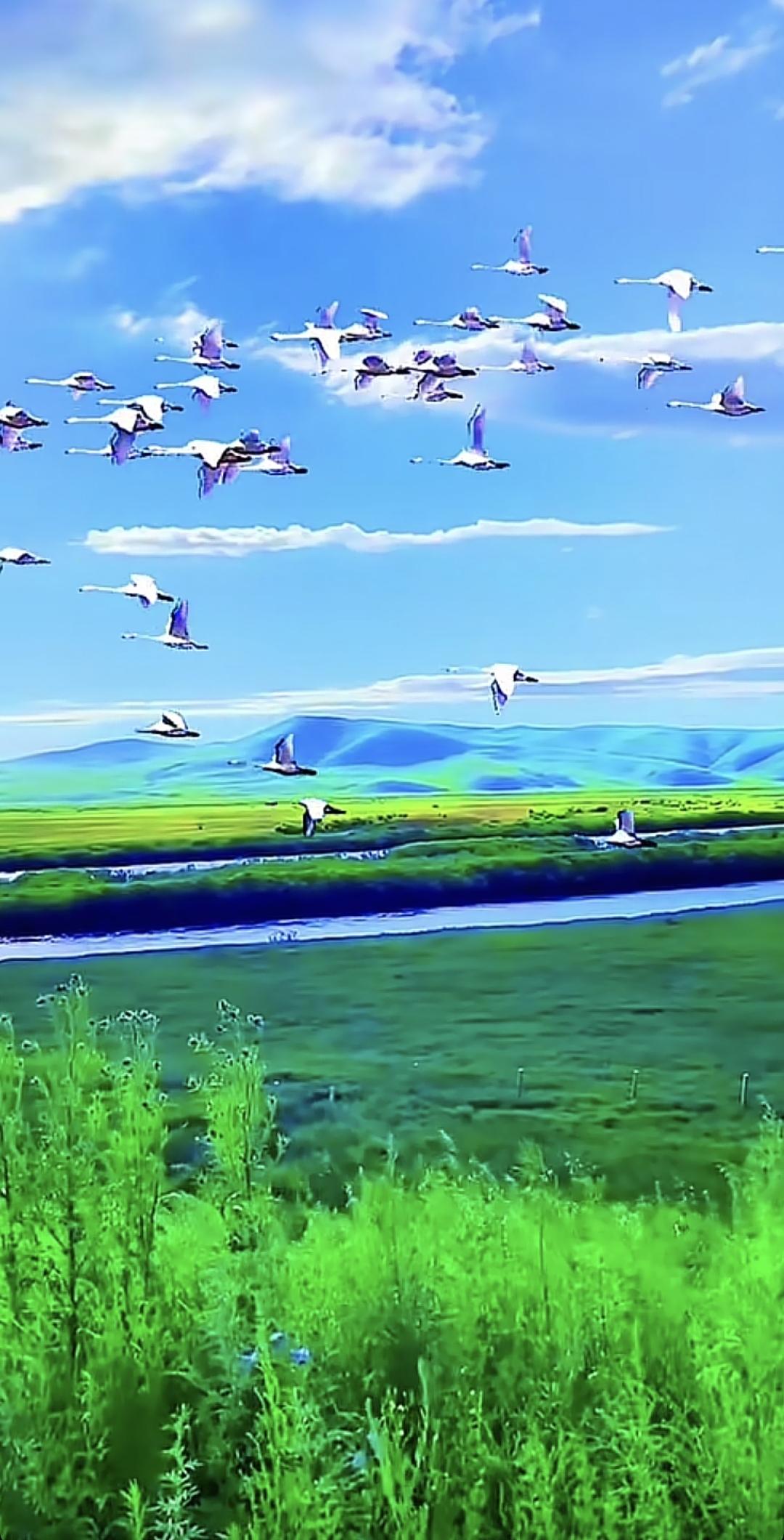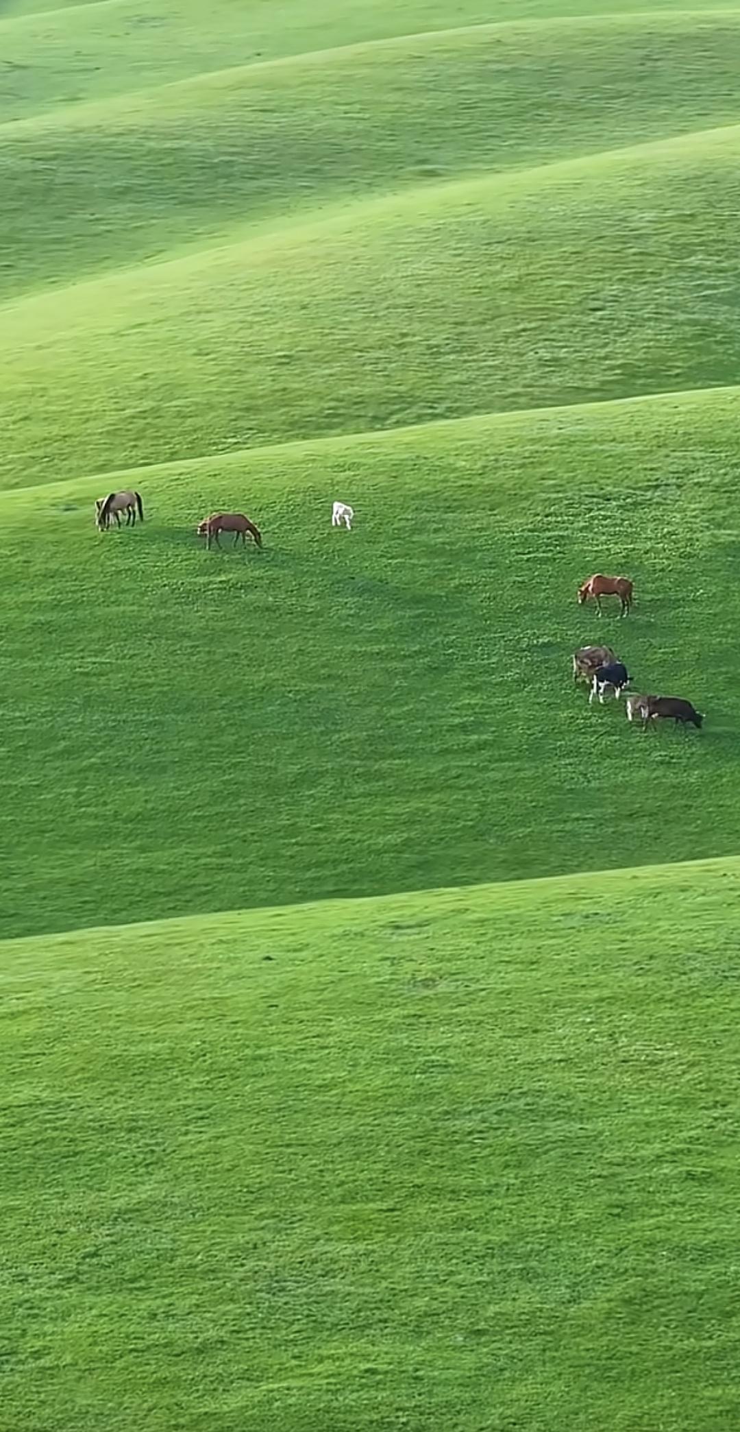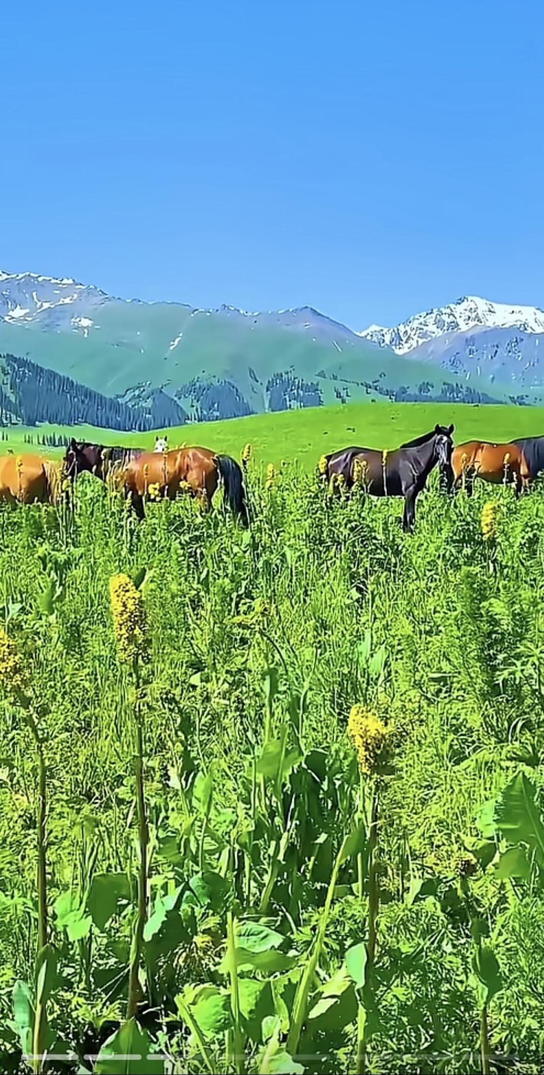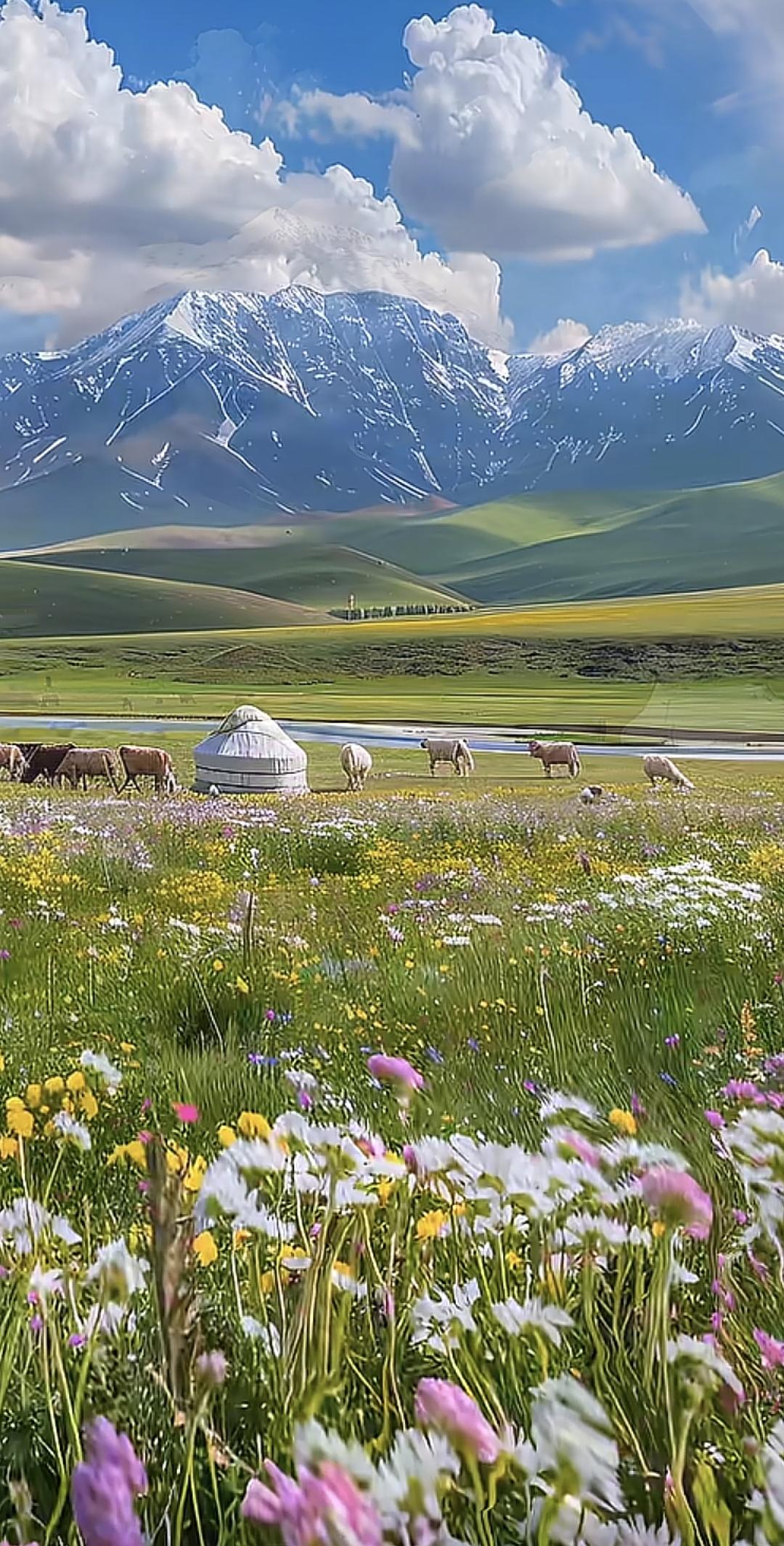 一片绿油油的草原,远处是雪山,风景真美!草原 风景 治愈系草原风光 蓝天白云蓝草