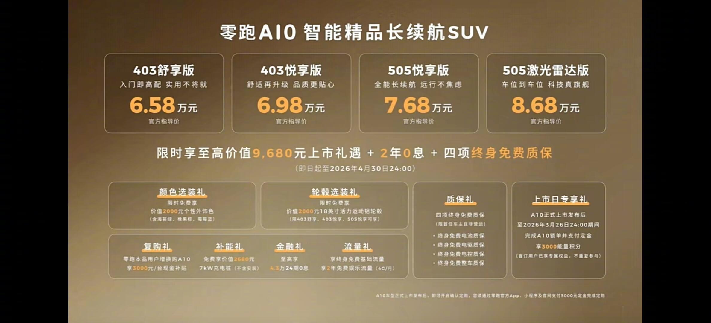 零跑A10上市,6.58万起。顶配给了座舱8295芯片、带激光雷达的高阶辅助驾驶