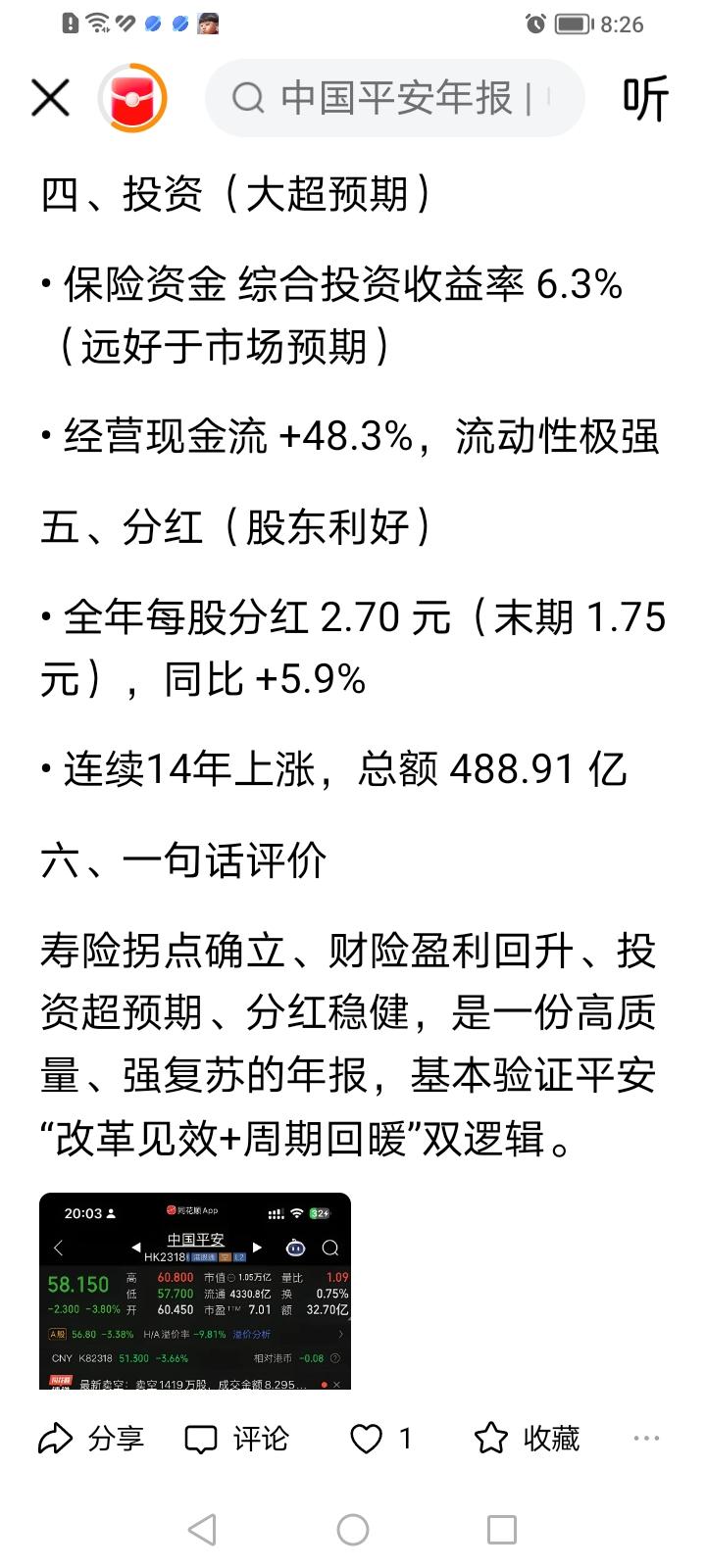 如何看待中国平安今晚披露的2025年年报呢?确实,保险公司的年报内容丰富,专业术语多,牵涉面广,晦涩难懂,非专业人士解读起来有点费劲,很多时候还侃不到点上。咱不揣鄙陋,简单聊四点: 1、稳。2025年实现归母净利润1347.78亿元,同比增长6.5%,实现了业绩的稳健增长。 2、明弱暗强。中国平安三季稻实现归母净利润1328亿元,全年1347.78亿元,这就意味着四季度仅实现了19亿元的净利润。是不是比较弱?但比起中国人寿三季度归母净利润1678亿元,全年归母净利润1540亿元,四季度亏损138亿元,中国平安又强了不少。 3、实。归母扣非净利润1437.73亿元,同比增长22.5%。经营功底很扎实。 4、升。现金分红总额连续14年保持上升。2025年中报、年报两次相加每股分红2.70元,同比上升5.9%。