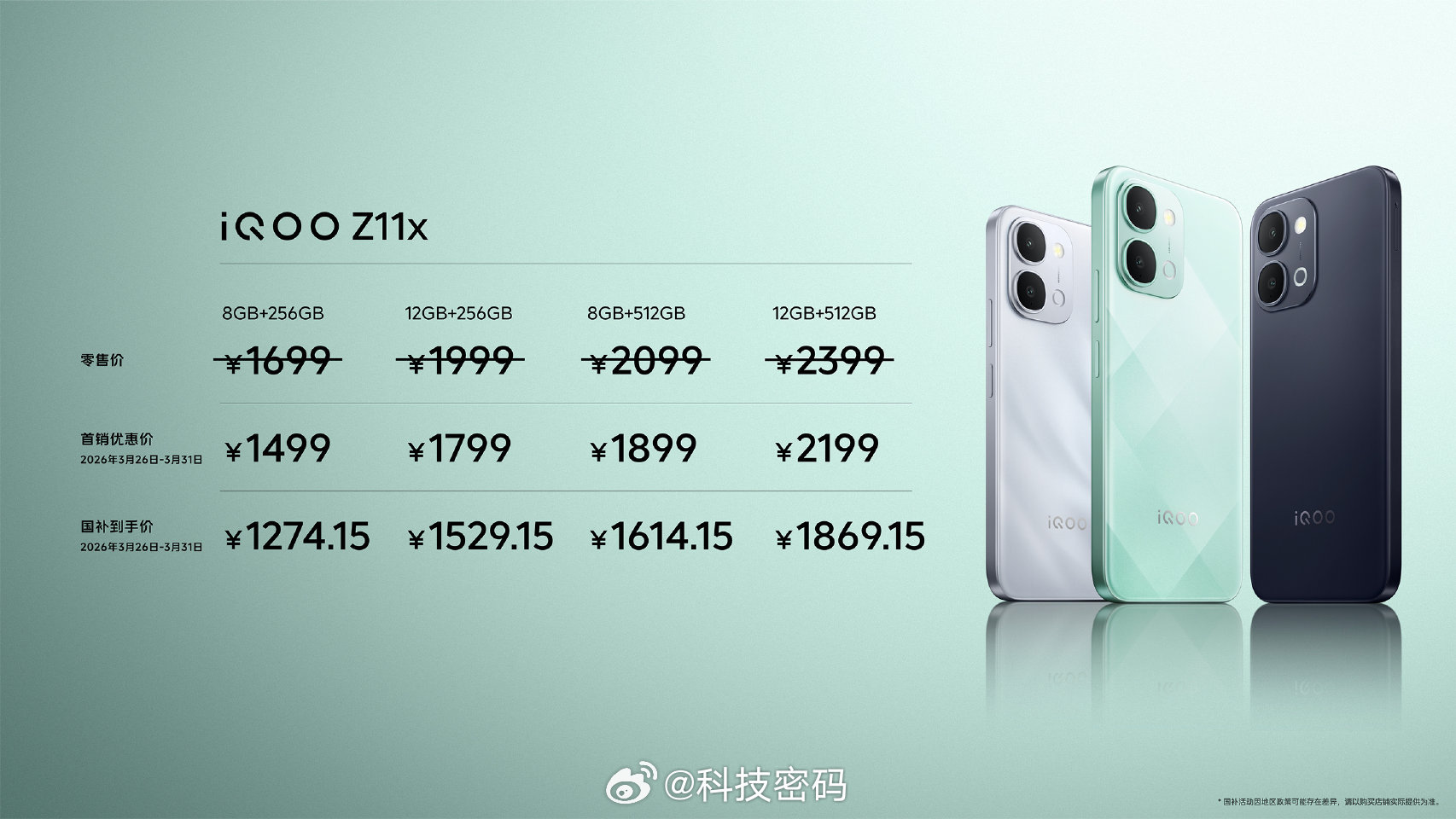 iQOO Z11x发布,国补后1274.15元三款配色:冰青绿、雪屿白、夜影黑,款款惊艳。外形采用大R角设计,视觉更高级优雅;-搭载天玑7400芯片,第二代台积电4nm工艺,7200mAh超薄蓝海电池;-6.76英寸护眼屏,自带DC调光,真正0频闪,最大屏幕亮度达1200nits,还通过了德国莱茵低蓝光认证。