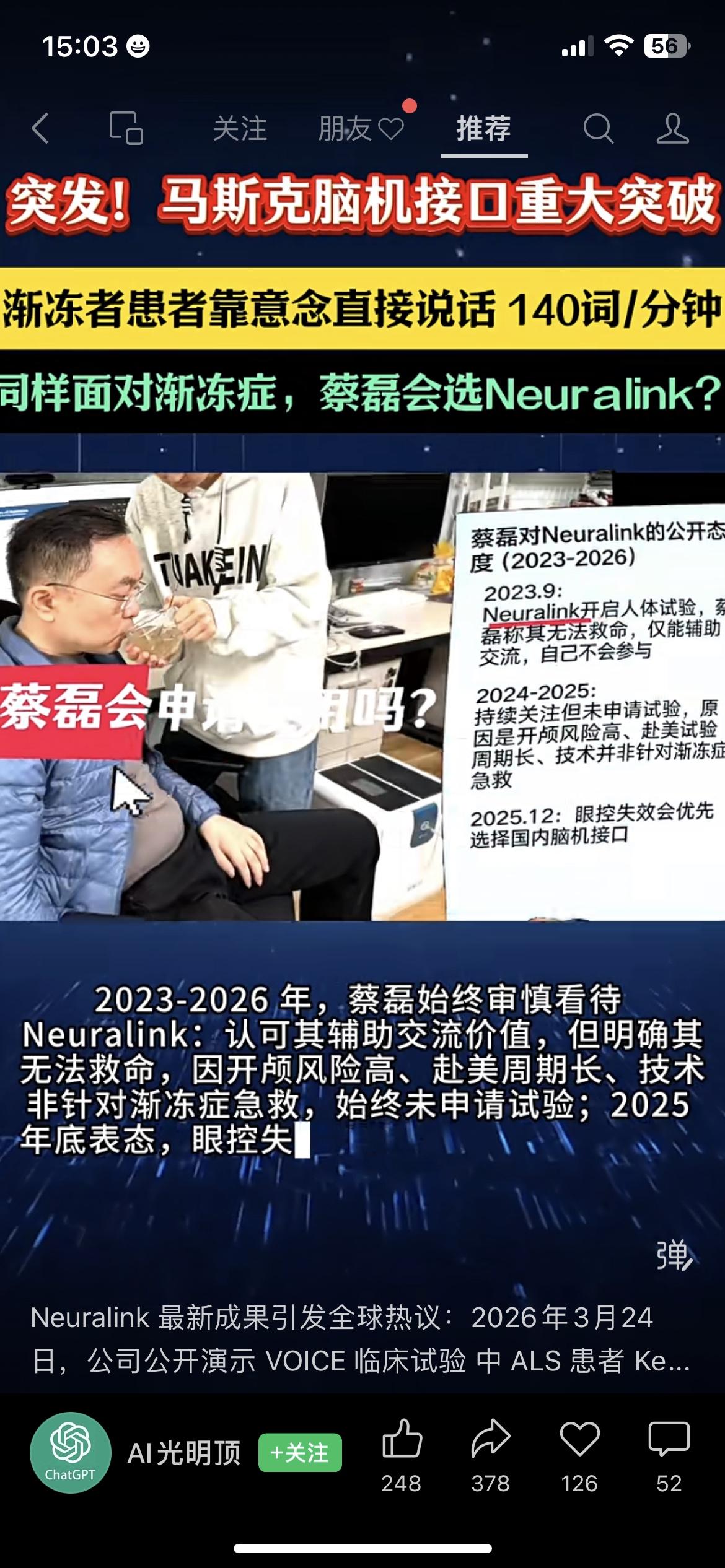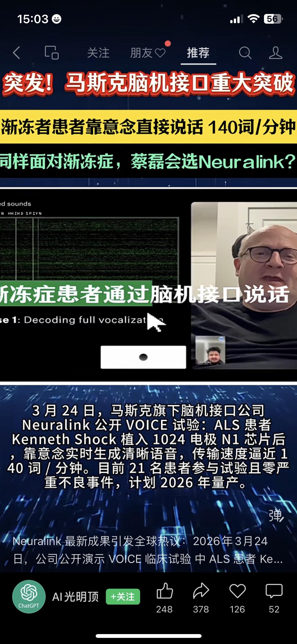 突发!马斯克脑机接口重大突破,渐冻症患者靠意念说话,速度达140词/分钟 太震撼了!科技正在改写渐冻症患者的命运!🔥 3月24日,马斯克Neuralink公布VOICE试验重磅结果:渐冻症患者植入1024电极芯片后,靠意念实时生成清晰语音,传输速度逼近140词/分钟,几乎和正常对话没差! 目前21名患者参与试验,零严重不良事件,计划2026年量产,这意味着渐冻症患者未来有望靠意念重新“说话”。 但蔡磊的态度也很清醒,他认可这项技术的辅助价值,但明确它不能治病,再加上开颅风险高、赴美周期长,他更倾向国内的脑机接口技术。 科技进步让人热泪盈眶,也让我们看到罕见病患者的希望。 你觉得脑机接口会是渐冻症患者的救命稻草吗?评论区聊聊! 脑机接口 Neuralink 马斯克 渐冻症