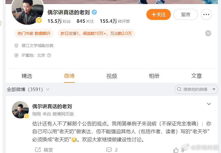 【#晋江副总裁再回应老天奶争议#】#晋江副总裁说不能强迫别人用老天奶# 26日,晋江副总裁:估计还有人不了解那个公告的观点。我用简单例子来说明(不保证完全准确):你自己可以用“老天奶”做表达,但不能强迫其他人(包括作者、读者)写的“老天爷”必须换成“老天奶”。欢迎大家继续做建设性讨论。 #晋江#