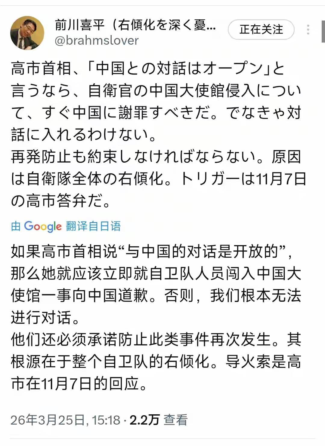 日本前文部科学事务次官前川喜平在3月25日公开发声。他直言,如果高市首相真的主张“对华对话保持开放”,那么针对自卫队人员非法闯入中国大使馆这一严重事件,就必须立刻向中方正式道歉,否则根本没有开启对话的资格。同时,日本政府还必须作出明确承诺,杜绝类似恶性事件再次发生。更关键的是,前川喜平一针见血地指出,这场风波的根源,是日本自卫队整体不断加剧的右倾化倾向,而高市早苗在去年11月7日发表的错误言论,正是点燃这一隐患的直接导火索。 这番表态,毫不留情地撕开了高市内阁的两面做派。嘴上说着愿意沟通、希望缓和对华关系,行动上却对违反《维也纳外交关系公约》、严重侵犯中国外交尊严与主权的闯馆事件含糊其辞,既不道歉,也不追责,更无半点反思。一边释放对话善意,一边纵容挑衅行为,这种自相矛盾的操作,本质上就是政治作秀,完全不具备两国平等对话的基本诚意。外交场合最忌讳虚与委蛇,没有正视错误的勇气,没有尊重主权的底线,所谓“开放对话”不过是一句空洞口号。 前川喜平的清醒之处,还在于他没有停留在事件表面,而是直指深层病灶。闯馆事件绝非偶然,而是日本右翼势力持续抬头、自卫队思想不断右倾化的必然结果。高市早苗上台以来,频频在涉台等核心问题上发表错误言论,刻意渲染对华对立,纵容极端思潮蔓延,自上而下传递出危险信号,最终让个别人员胆大妄为,做出践踏外交准则、冲击中国使馆的荒唐行为。可以说,正是政客的激进表态,为右翼行为提供了土壤,最终演变成损害两国关系的严重事件。 在日本政坛整体偏右、对华强硬成风的氛围里,前川喜平敢于直言不讳,实属难得的理性之声。他不仅批评了政府的敷衍态度,更点明了破局之道:日本只有正视自身问题,就闯馆事件正式道歉,切实遏制自卫队右倾化,停止制造对立,才能重新建立互信,为中日对话创造真正条件。如果继续一边挑衅一边谈对话,只会让两国关系持续恶化,最终损害的还是日本自身的利益。