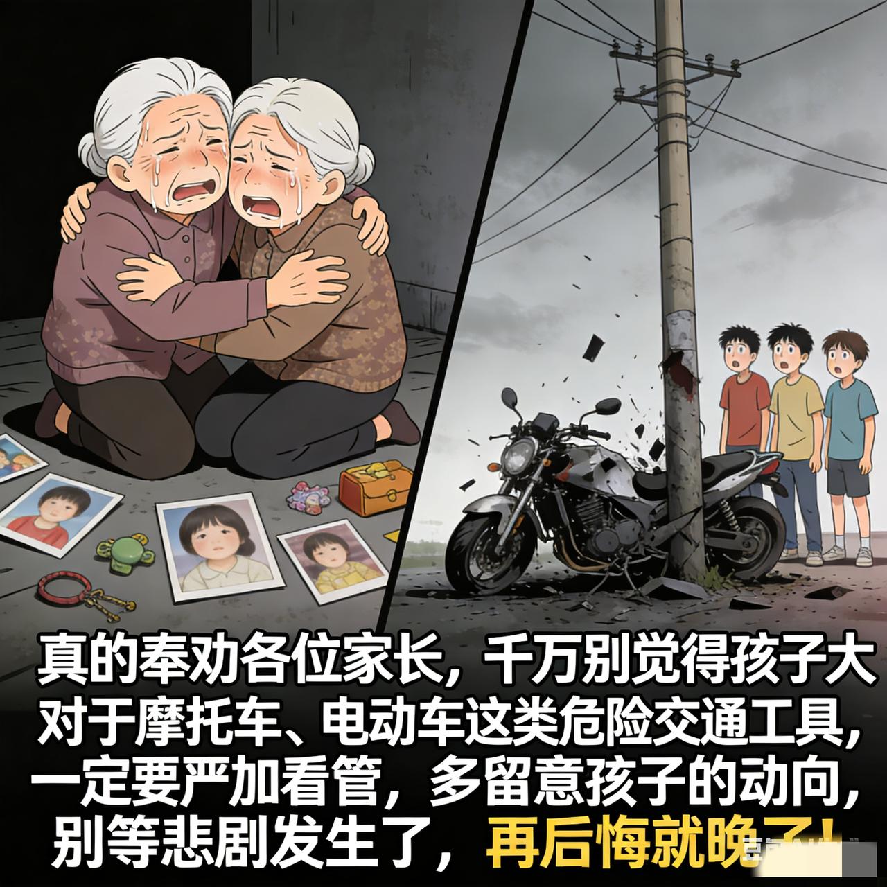 泪奔!小区大姐一番话戳心!孩子大了更要盯紧,这种车买了千万要防备! 今天跟小区里一位大姐聊天,她的一番话听得我心里直发酸,也想提醒所有家长,孩子长大了,反而要多操一份心。 大姐说,她邻居家老两口好不容易老年得子,从小把儿子宠成宝,好不容易把孩子拉扯大,本以为能享清福,结果却迎来了灭顶之灾。 上周末,孩子偷偷买了摩托车,瞒着父母带同学出去兜风,没想到路上发生意外,直接撞在了电线杆上,年轻的生命瞬间没了。 老两口得知消息当场崩溃,白发人送黑发人的痛,光是想想都觉得窒息。好好的一个家,就因为一辆摩托车彻底毁了。 真的奉劝各位家长,千万别觉得孩子大了就能放手,对于摩托车、电动车这类危险交通工具,一定要严加看管,多留意孩子的动向,别等悲剧发生了,再后悔就晚了! 我的2026
