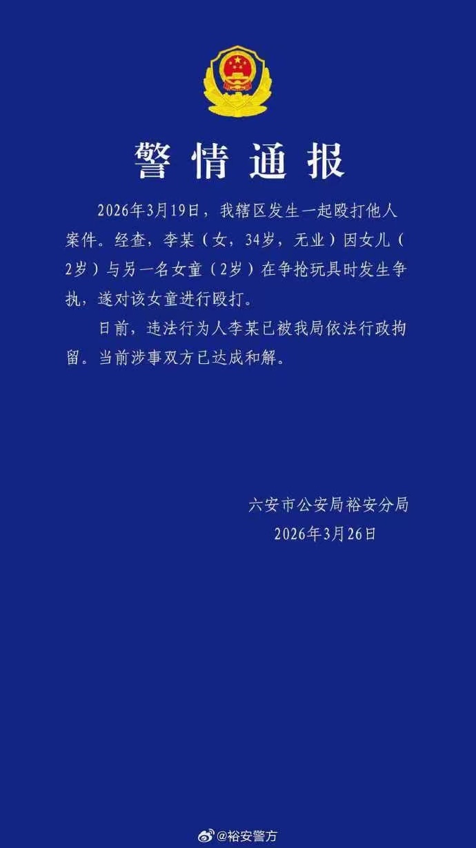 因抢玩具殴打2岁女童女子被行拘打人的孩子妈被行拘了。