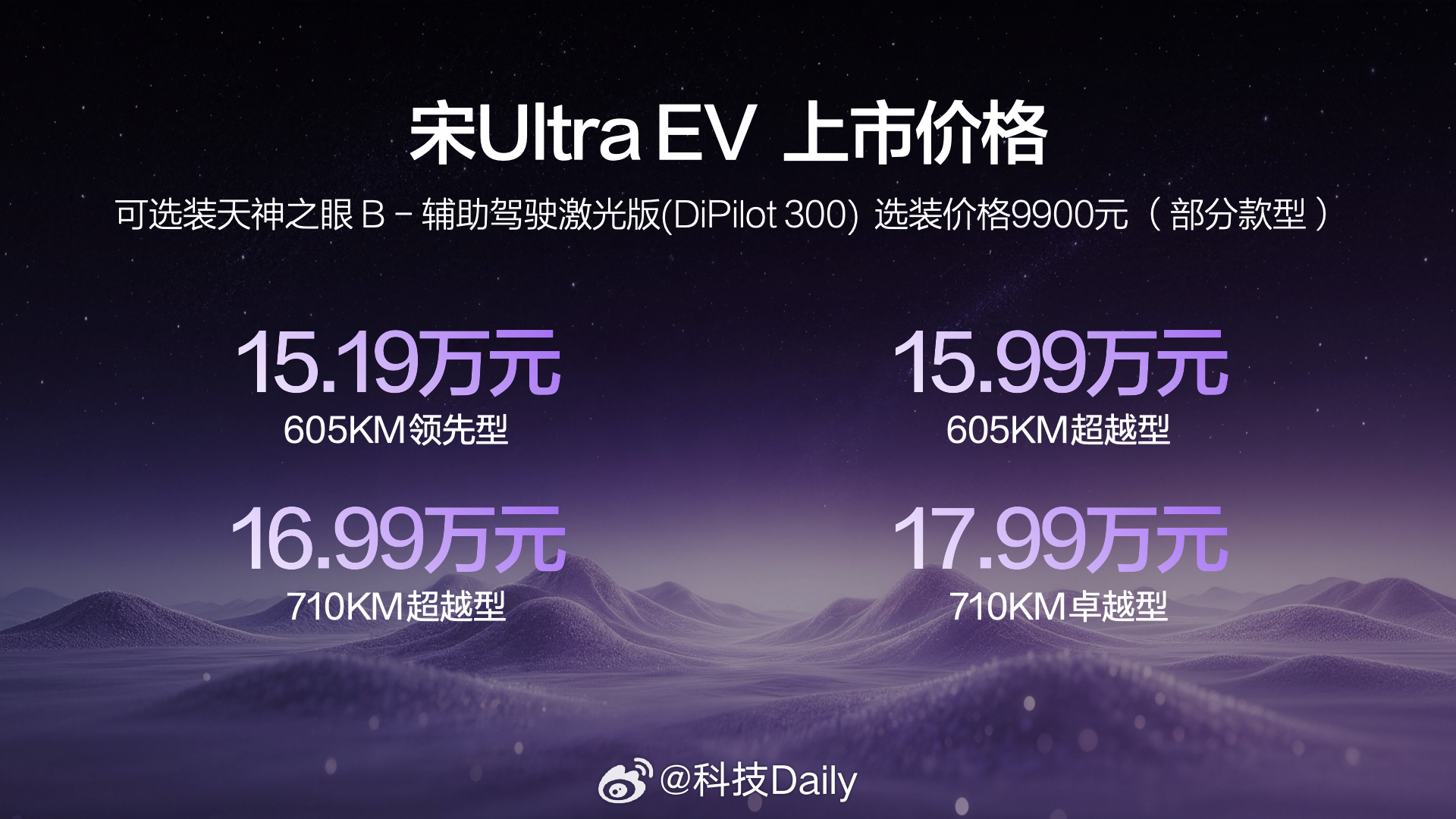比亚迪宋Ultra EV登场!B级SUV闪充时代开启,605KM领先型、605KM超越型、710KM超越型和710KM卓越型,官方指导价15.19万-17.99万元,充电快长续航真的爽。宋Ultra全系标配闪充15.19万起宋Uitra引领B级SUV进入闪充时代比亚迪第二代刀片电池及闪充技术,天神之眼B、云辇-C、TBC高速爆胎稳行系统,配置打满,真豪华真可靠。