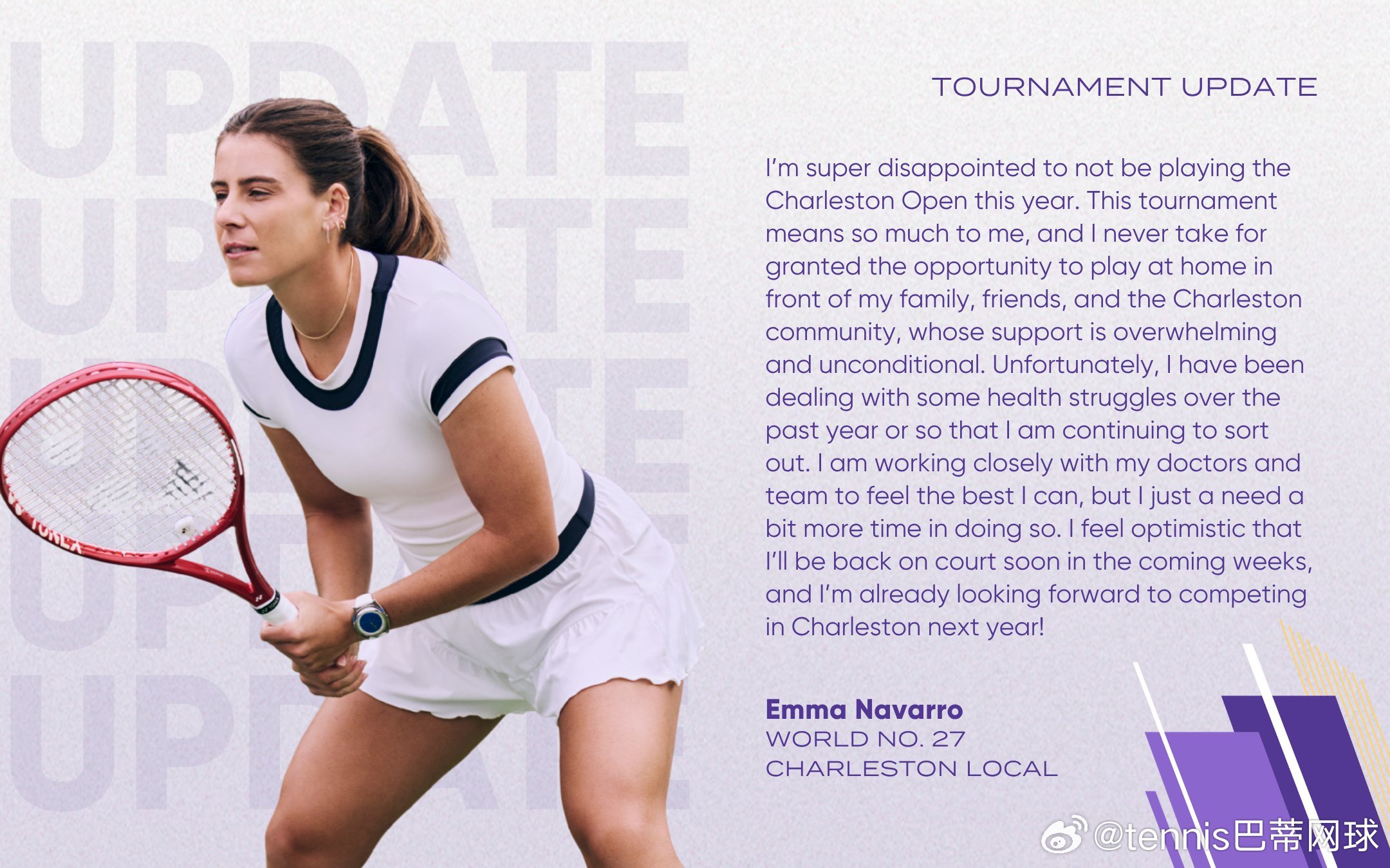 遗憾的是,过去一年我一直受健康问题困扰,目前仍在积极调理。我正与医疗团队紧密配合,力求恢复最佳状态,只是需要再多一点时间。我相信很快就能重返赛场,也已经开始期待明年在查尔斯顿再战”