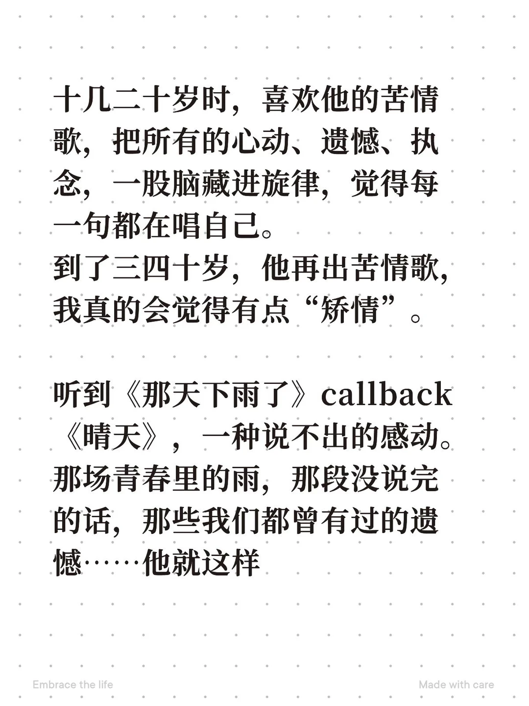 听到《那天下雨了》callback《晴天》,一种说不出的感动。那场青春里的雨,那段没说完的话,那些我们都曾有过的遗憾……他就这样把我多年幻想过的某种偶遇轻轻的写了出来。