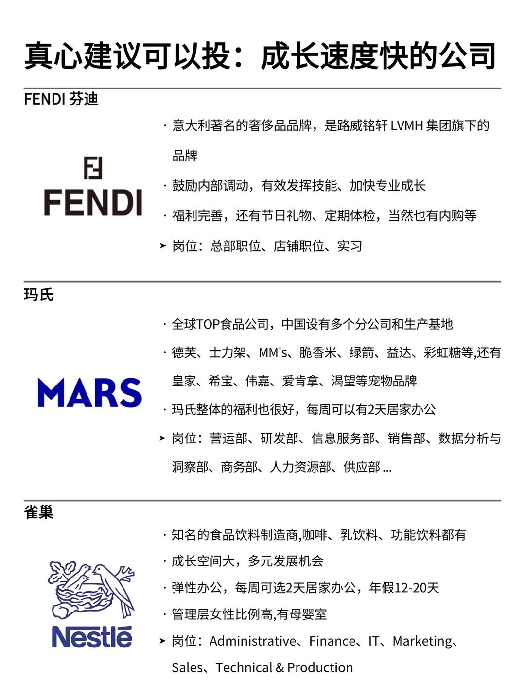 金三银四,不止是多投,而是要投对方向。 我真心建议大家去投那些成长速度快的公司 . ✅最理想的公司,其实可以看这两方面: 一方面是公司平台好,有稳定的保障,也有可观的前景,有能长期发展的空间 另一方面是公司设置了各阶段清晰的培养机制,成长空间和晋升速度快,可以实现快速发展 . 👉🏻图上这几家都是很不错的!值得在3月去冲一波 . 坚持日更✊🏻,帮大家在找工作路上顺利拿到offer! .