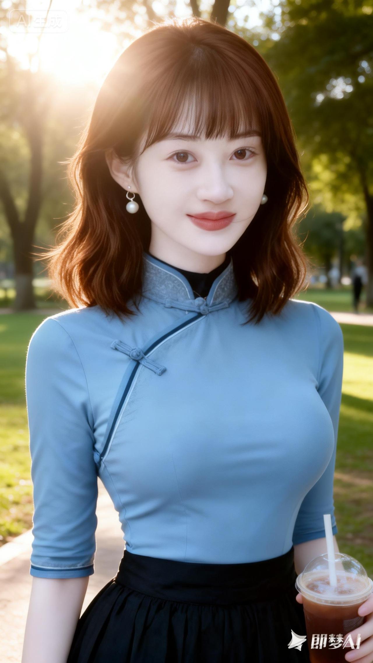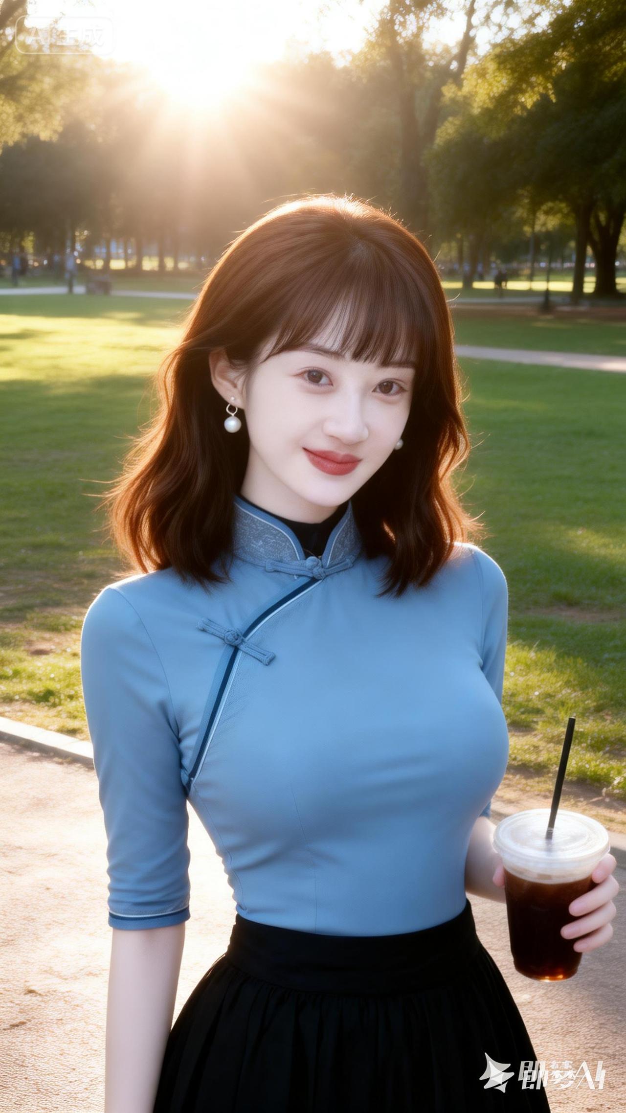 阳光下的清新少女,蓝裙黑裙搭配,手拿奶茶,元气满满!🌞💕