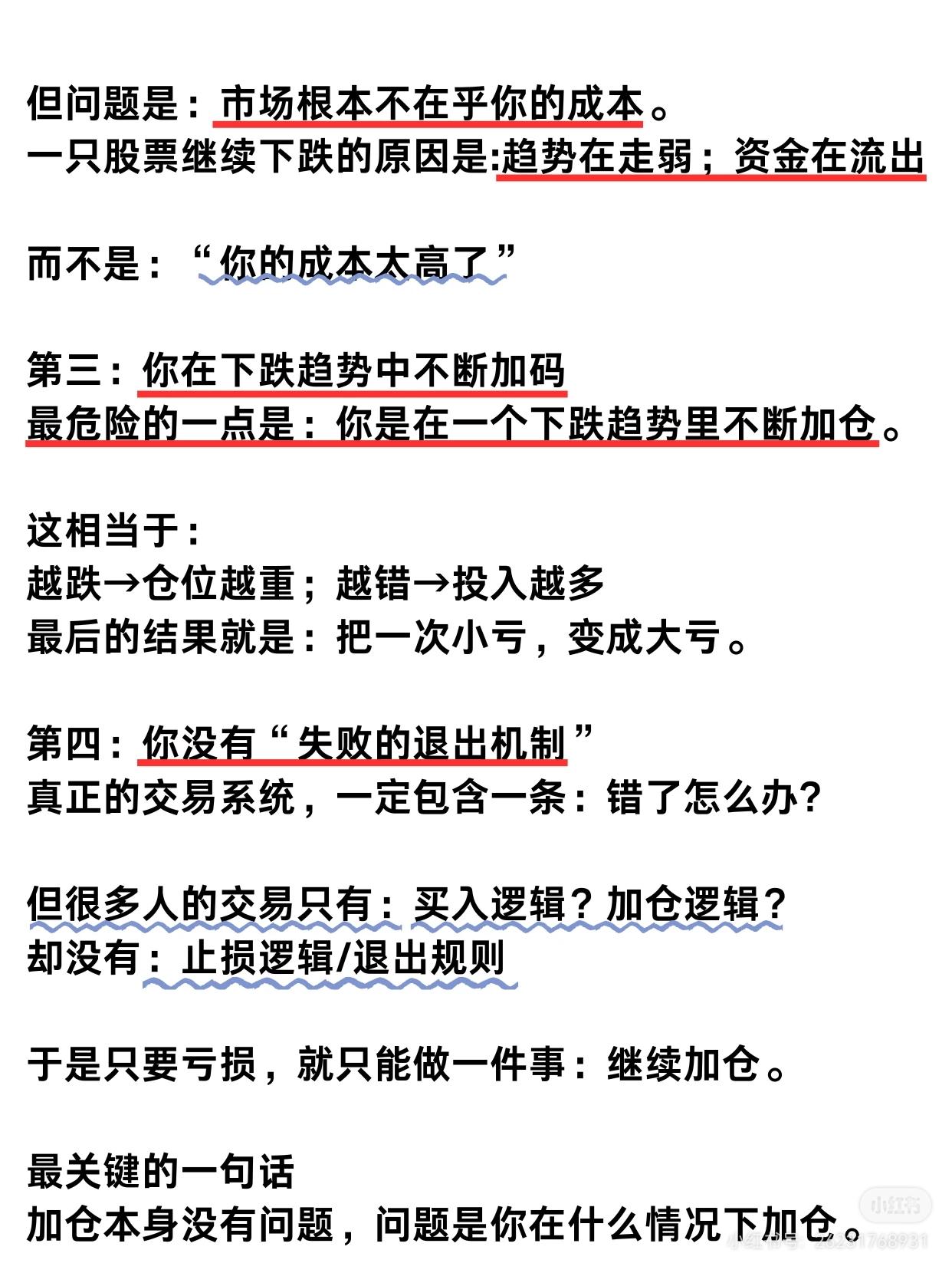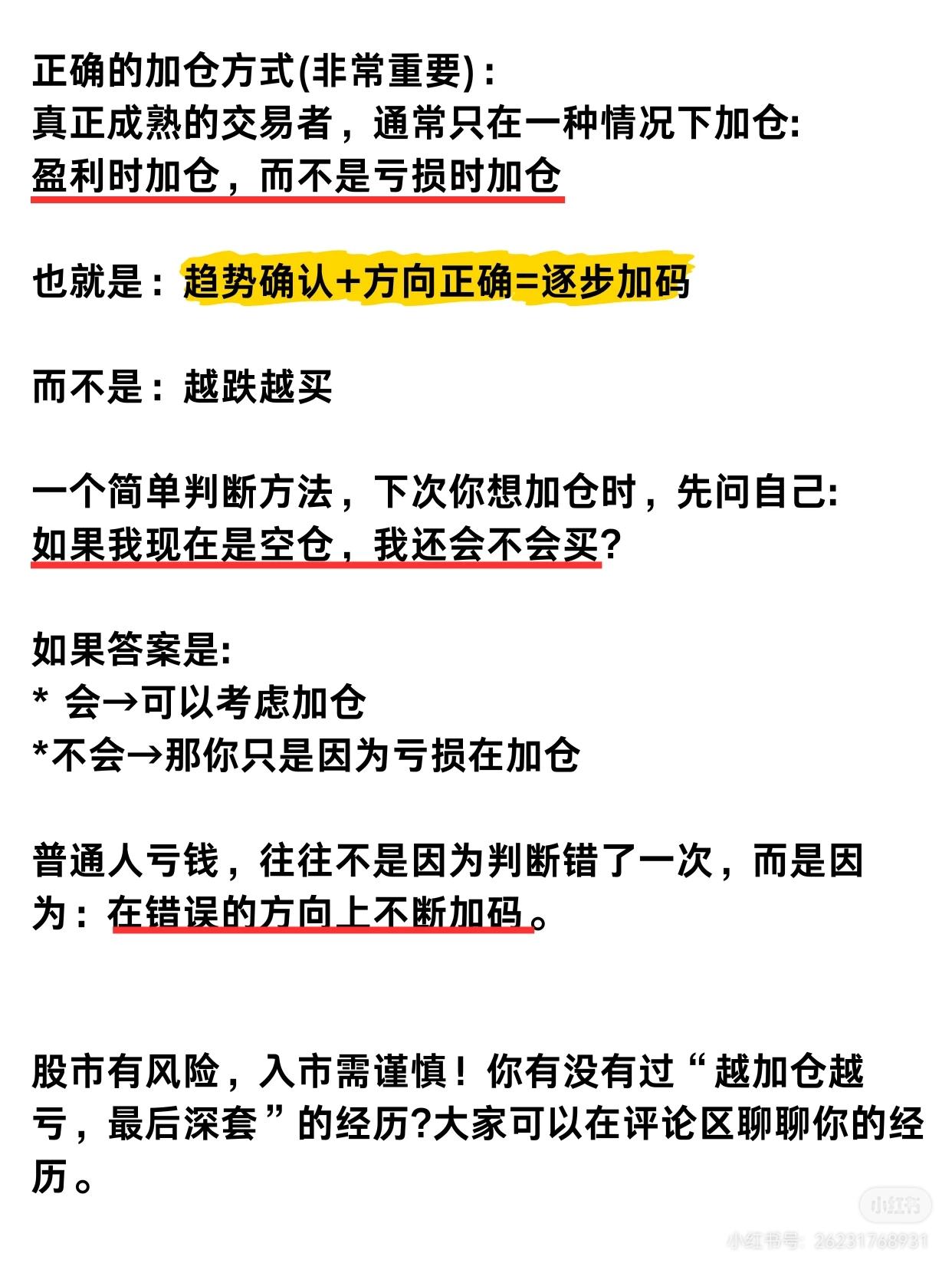 关于股票投资中“越加仓越亏”现象的分析,主要分为三个部分:分析错误加仓的原因、指出其背后的误区,并提出正确的加仓策略。 为什么你会越加仓越亏? 一、错误的加仓行为 许多人习惯在股票下跌时加仓: * 跌10%加仓,跌20%再加仓,跌30%继续补。 * 误以为这样可以摊低成本,等待反弹回本。 * 现实结果:越补越亏,越套越深。 二、为什么会这样?(四大误区) 1. 情绪对抗,而非理性交易: * 亏损时的加仓是为了“把亏的钱赚回来”,本质是情绪对抗,而非基于市场判断的投资。 2. 把“成本价”当成真理: * 市场根本不在乎你的成本。股票下跌是因为趋势走弱、资金流出,而非“你的成本太高了”。 3. 在下跌趋势中不断加码: * 越跌→仓位越重;越错→投入越多。 * 结果:把一次小亏,变成大亏。 4. 没有“失败的退出机制”: * 交易系统只有买入和加仓逻辑,却没有止损逻辑或退出规则。 * 于是只要亏损,就只能继续加仓。 三、正确的加仓方式 * 核心原则:盈利时加仓,而不是亏损时加仓。 * 前提条件:趋势确认 + 方向正确 = 逐步加码。 * 简单判断方法:下次想加仓时,先问自己:“如果我现在是空仓,我还会不会买?” * 会 → 可以考虑加仓。 * 不会 → 那你只是因为亏损在加仓。 * 普通人的亏损根源:不是判断错了一次,而是在错误的方向上不断加码。 最后提醒:股市有风险,入市需谨慎。加仓本身没有问题,问题是你在什么情况下加仓。