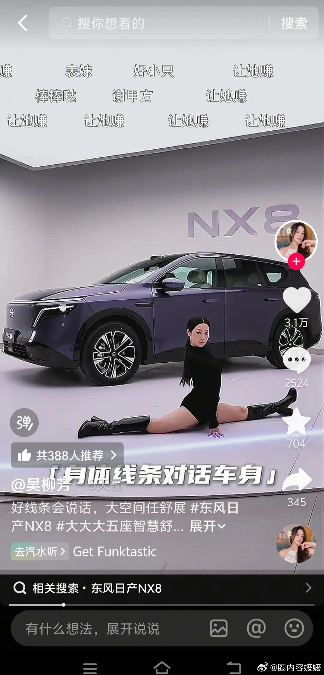 吴柳芳终于是好起来了。账号视频画风大变,还接到了汽车广告。网友纷纷发弹幕:让她赚