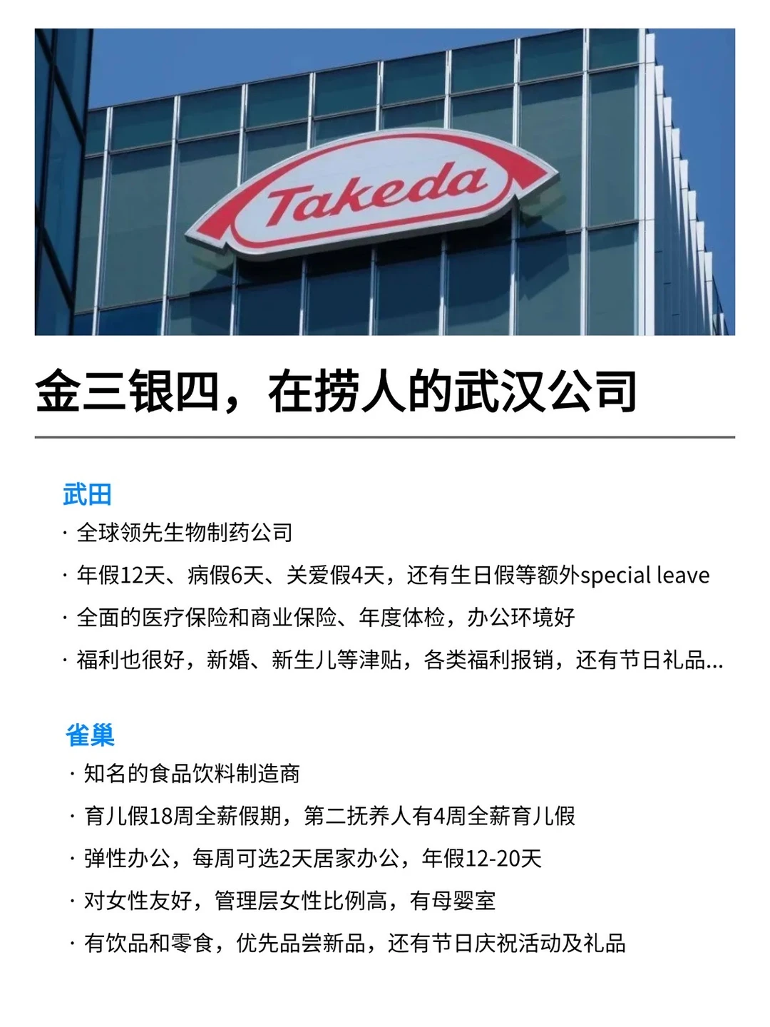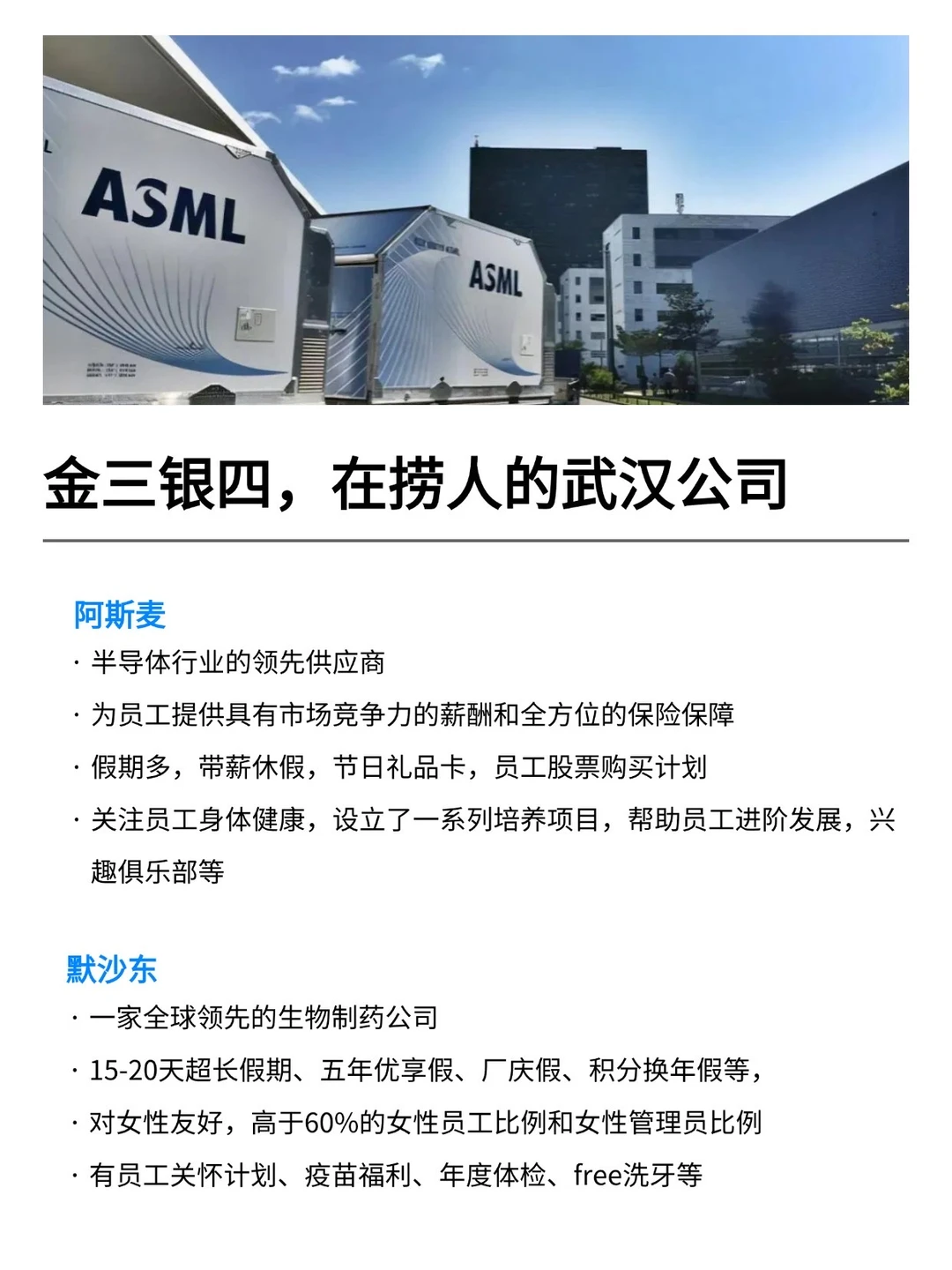 武汉发展真的越来越好,有不少小而美、冷门宝藏的公司,金三银四是真的很多的机会! 特别是有不少小众冷门的外企,真心建议大家可以去试试 · 大家不要觉得外企很难进 其实外企也有一些常规类、英语要求没有那么高的岗位 · 为什么还是值得去外企? ▪️氛围好,对女性友好,年假长,平均年假都是15天 ▪️还支持居家办公、福利完善,是真的能实现WLB ▪️待遇也还不错,这段时间找工作的真的可以考虑考虑~ · 坚持日更,帮大家在找工作路上顺利拿 offer! ·