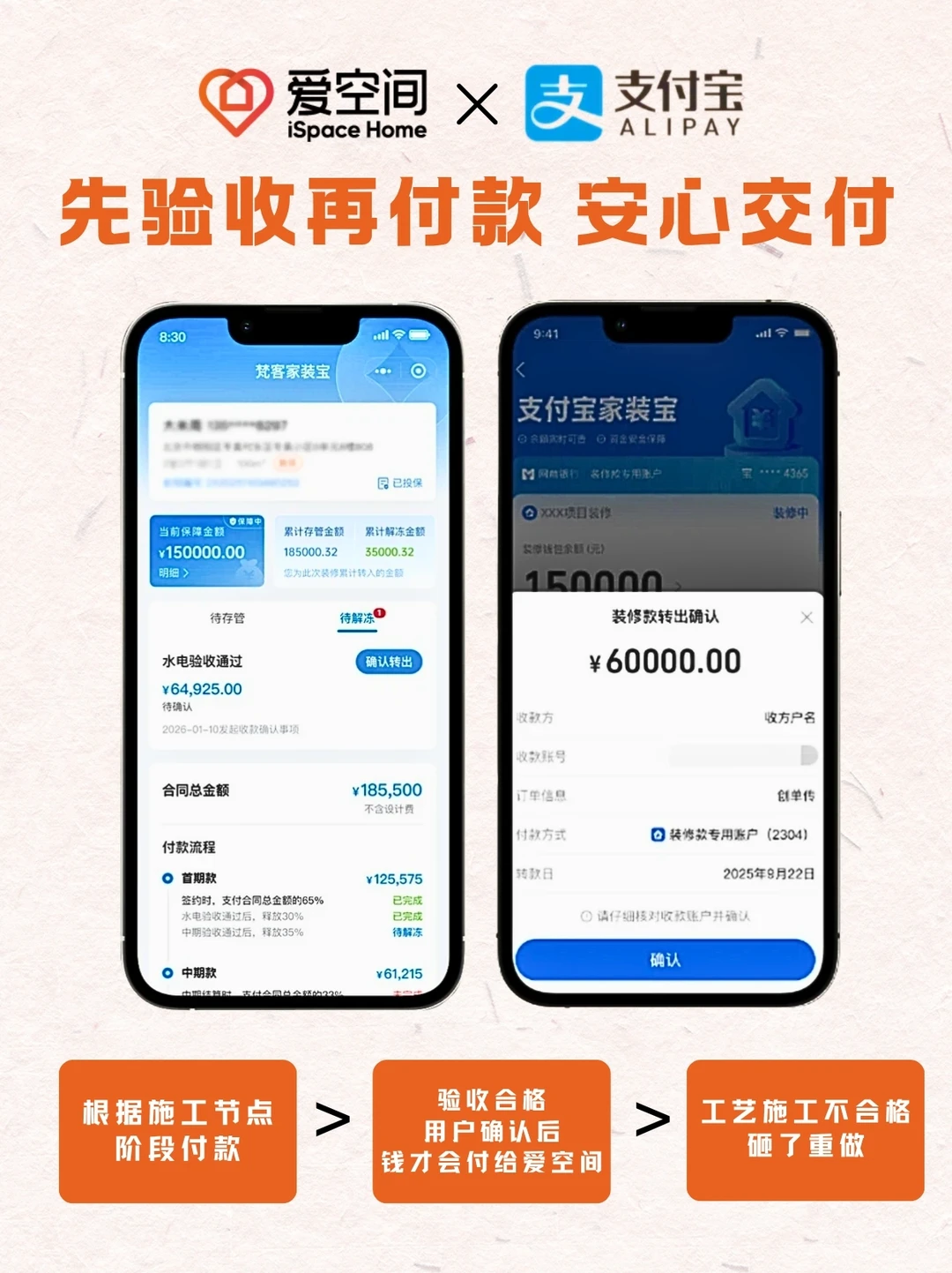 装修款全程锁在支付宝,我们碰不到、也挪不走。每一笔解冻记录像订单物流一样可查,打开手机就能看到:付给了哪道工序、还剩多少