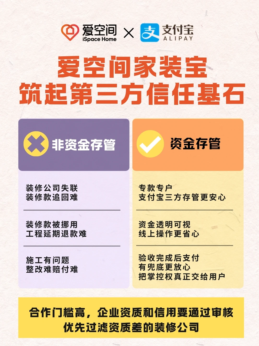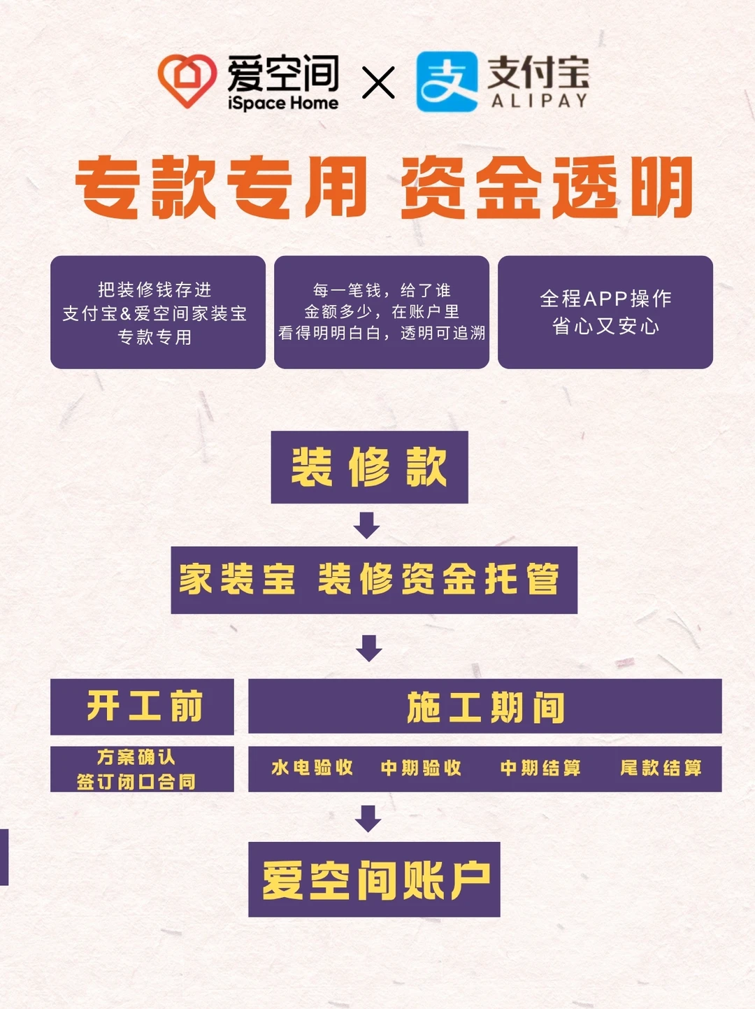 我们公司联合支付宝推出了「家装宝」第三方资金存管服务—— 你的装修款,存在你自己的支付宝账户里