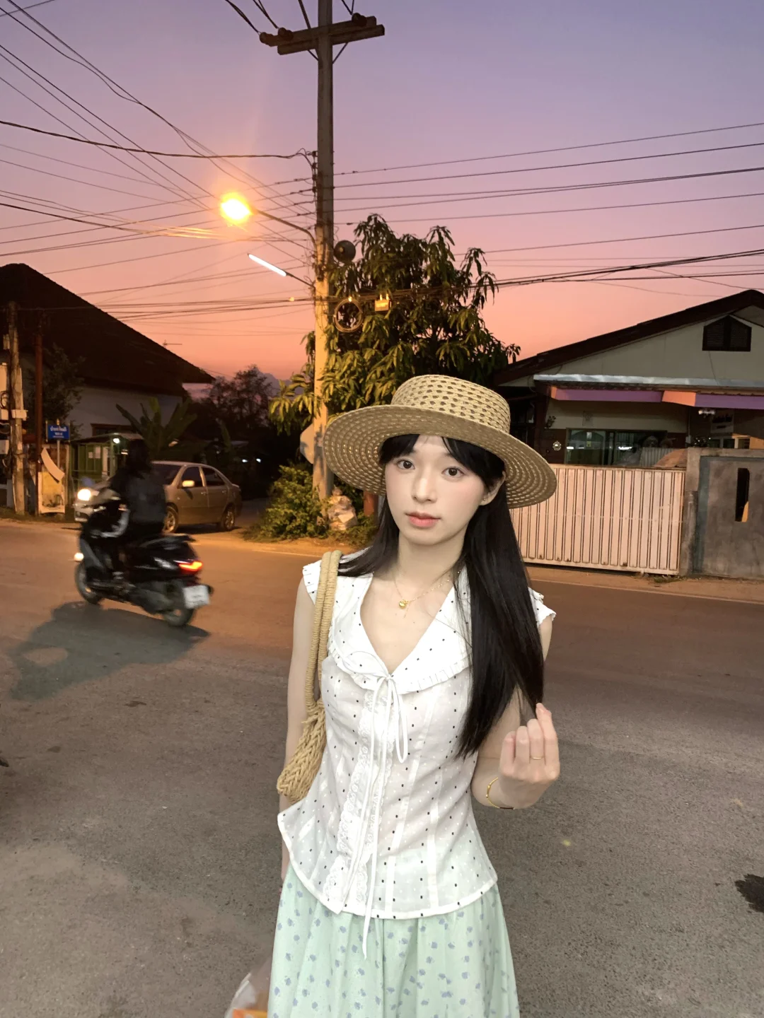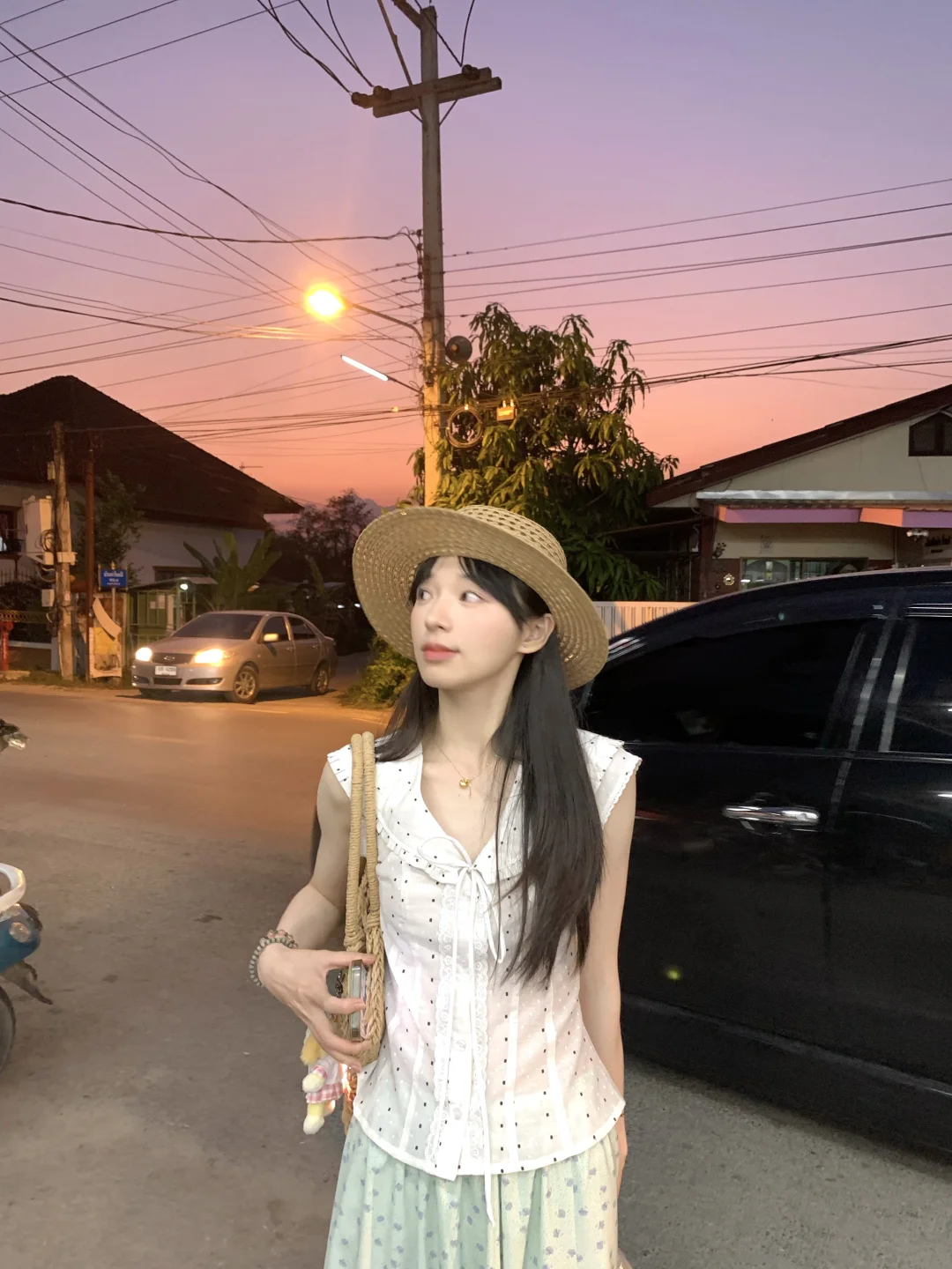 夏日街拍,长发飘逸,白色背心+灰色牛仔裤,清新自然。