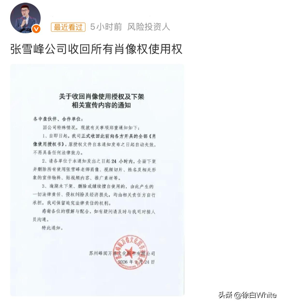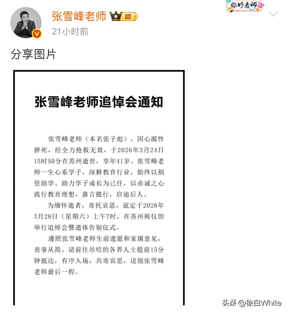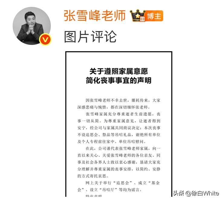 3月26日,谁在负责张雪峰的身后事? 如此的有条不紊,连续三天晚上发布通知 24号晚发布讣告,25号晚发布追悼会通知,以及家属简化追悼通知,26号晚发布收回肖像使用权通知,一天一个通知一件事,都安排在晚上发,尽可能不占用公共资源! 面临这样的突发情况,能做到如此,负责张雪峰身后事的主导话语人真的很冷静,同时很理智!属实佩服,通过通知大概了解了一下,基本是家属跟公司共同商量的结果,大家在哀伤之余,还是尽最大程度确保把张雪峰的身后事给办好,不留一丝话柄!