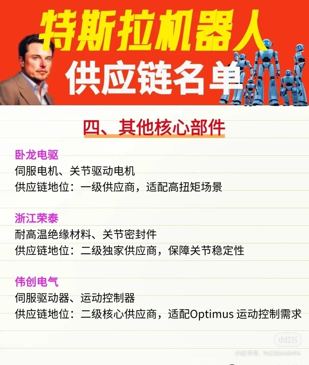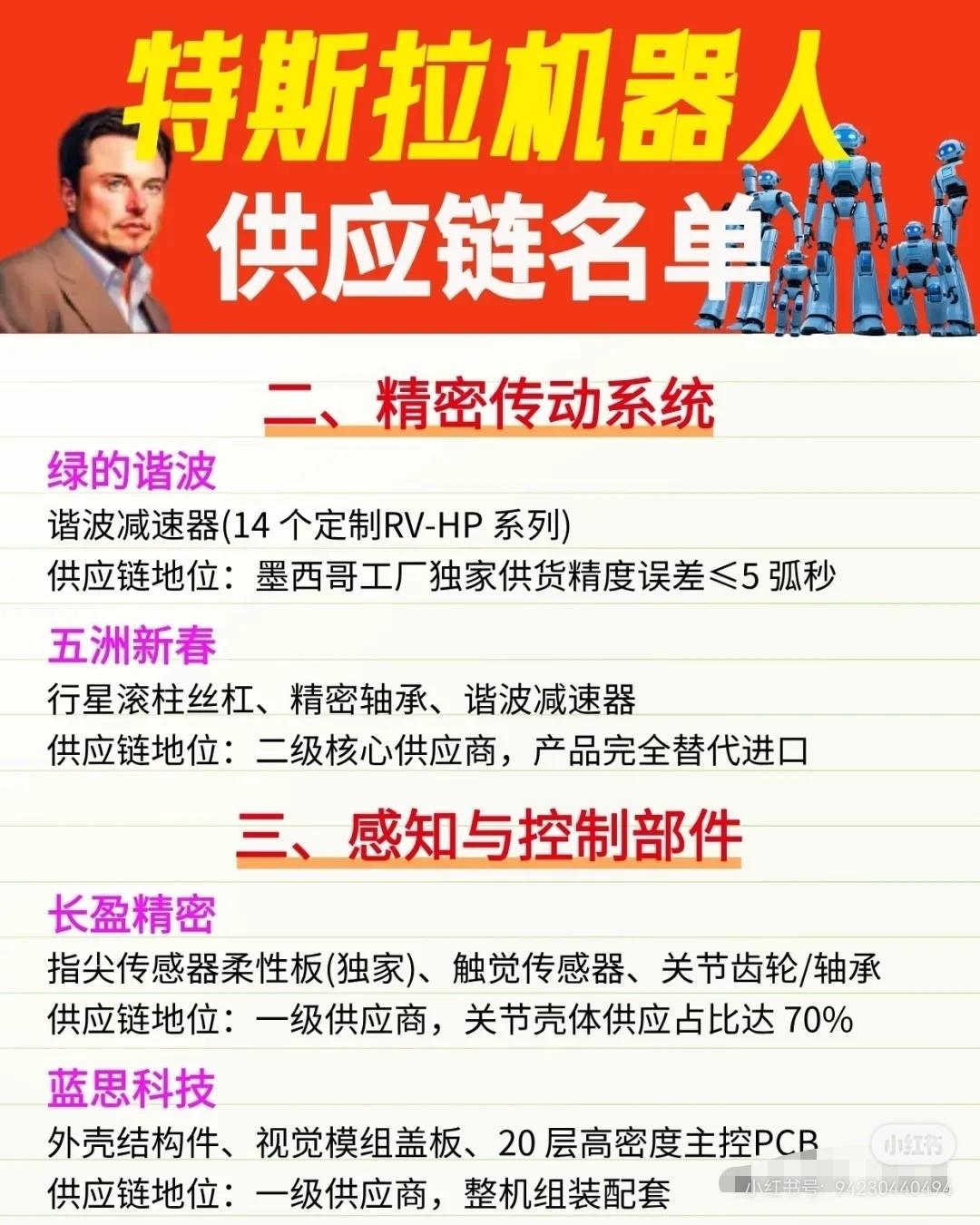 特斯拉机器人供应链名单,收藏研究 一、核心执行器总成 * 三花智控:旋转执行器总成、液冷散热模组、域控+执行器一体化方案;一级独家供应商,适配22个自由度关节。 * 拓普集团:直线执行器总成、腿部/腰部关节模组、灵巧手驱动部件;一级独家供应商,宁波基地规划产能50万台/年。 * 恒立液压:高压液压执行器、电缸组件;一级供应商,定位精度±0.03mm。 二、精密传动系统 * 绿的谐波:谐波减速器(14个定制RV-HP系列);墨西哥工厂独家供货,精度误差≤5弧秒。 * 五洲新春:行星滚柱丝杠、精密轴承、谐波减速器;二级核心供应商,产品完全替代进口。 三、感知与控制部件 * 长盈精密:指尖传感器柔性板(独家)、触觉传感器、关节齿轮/轴承;一级供应商,关节壳体供应占比达70%。 * 蓝思科技:外壳结构件、视觉模组盖板、20层高密度主控PCB;一级供应商,整机组装配套。 四、其他核心部件 * 卧龙电驱:伺服电机、关节驱动电机;一级供应商,适配高扭矩场景。 * 浙江荣泰:耐高温绝缘材料、关节密封件;二级独家供应商,保障关节稳定性。 * 伟创电气:伺服驱动器、运动控制器;二级核心供应商,适配Optimus运动控制需求。