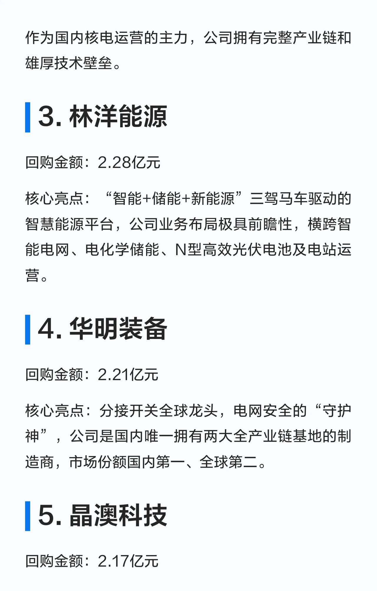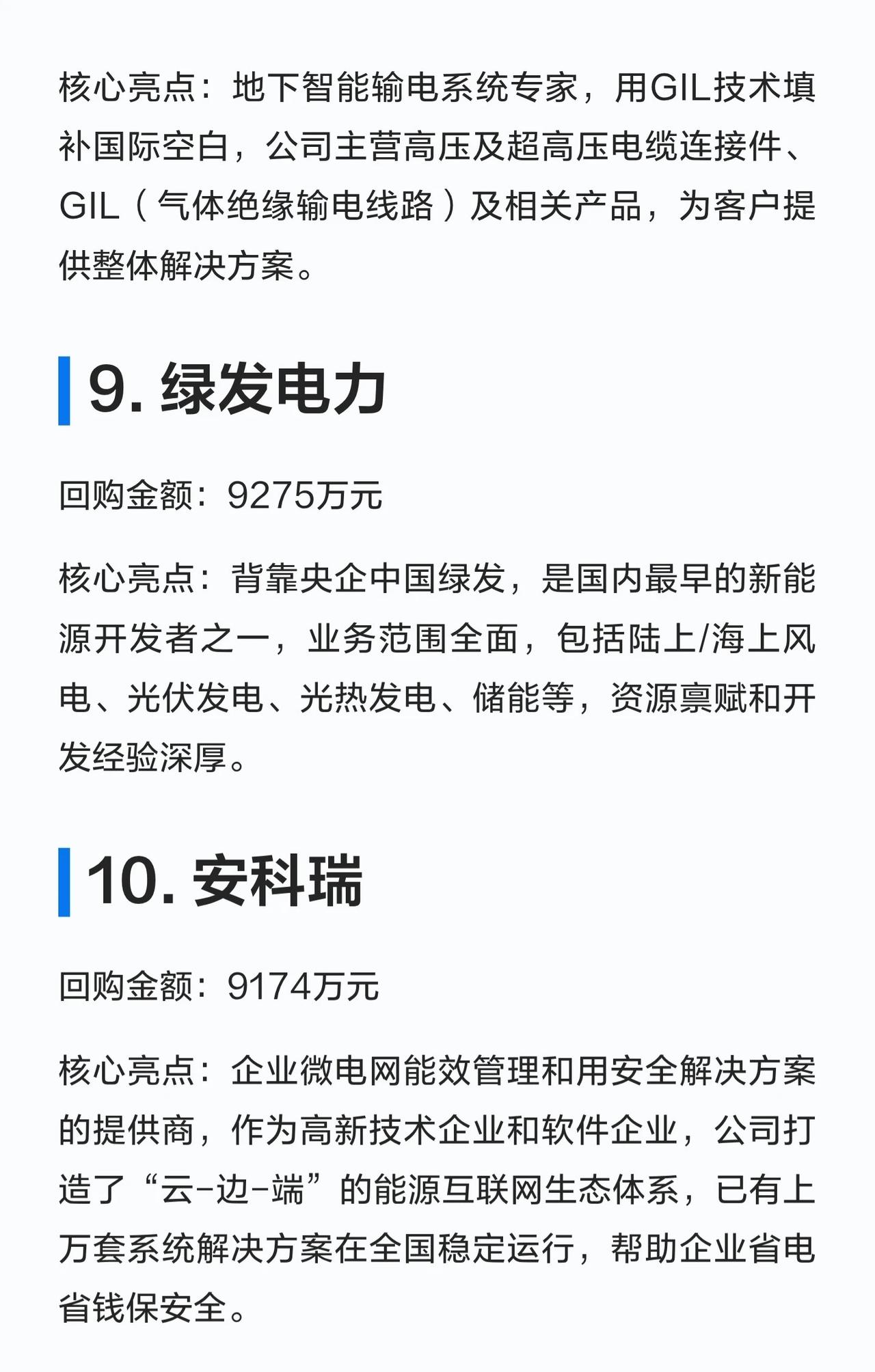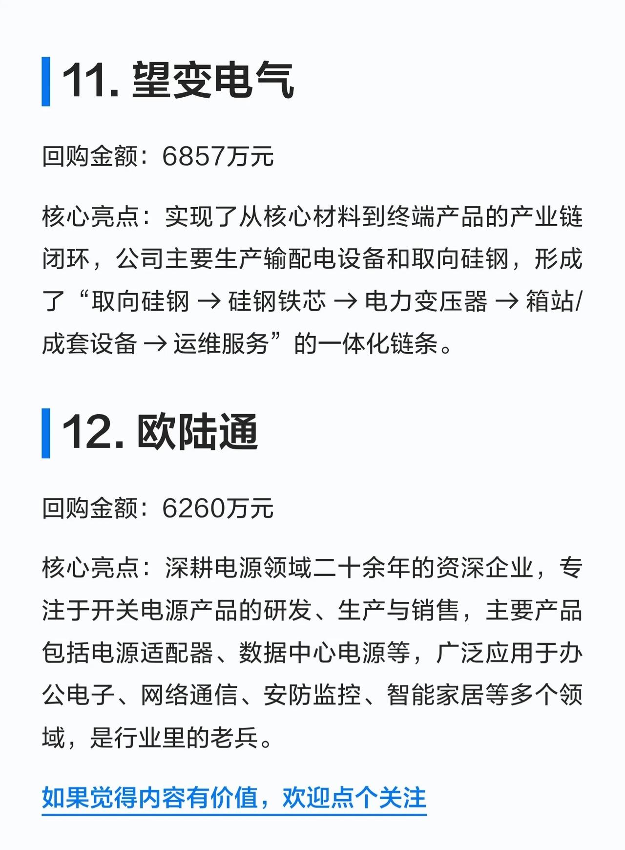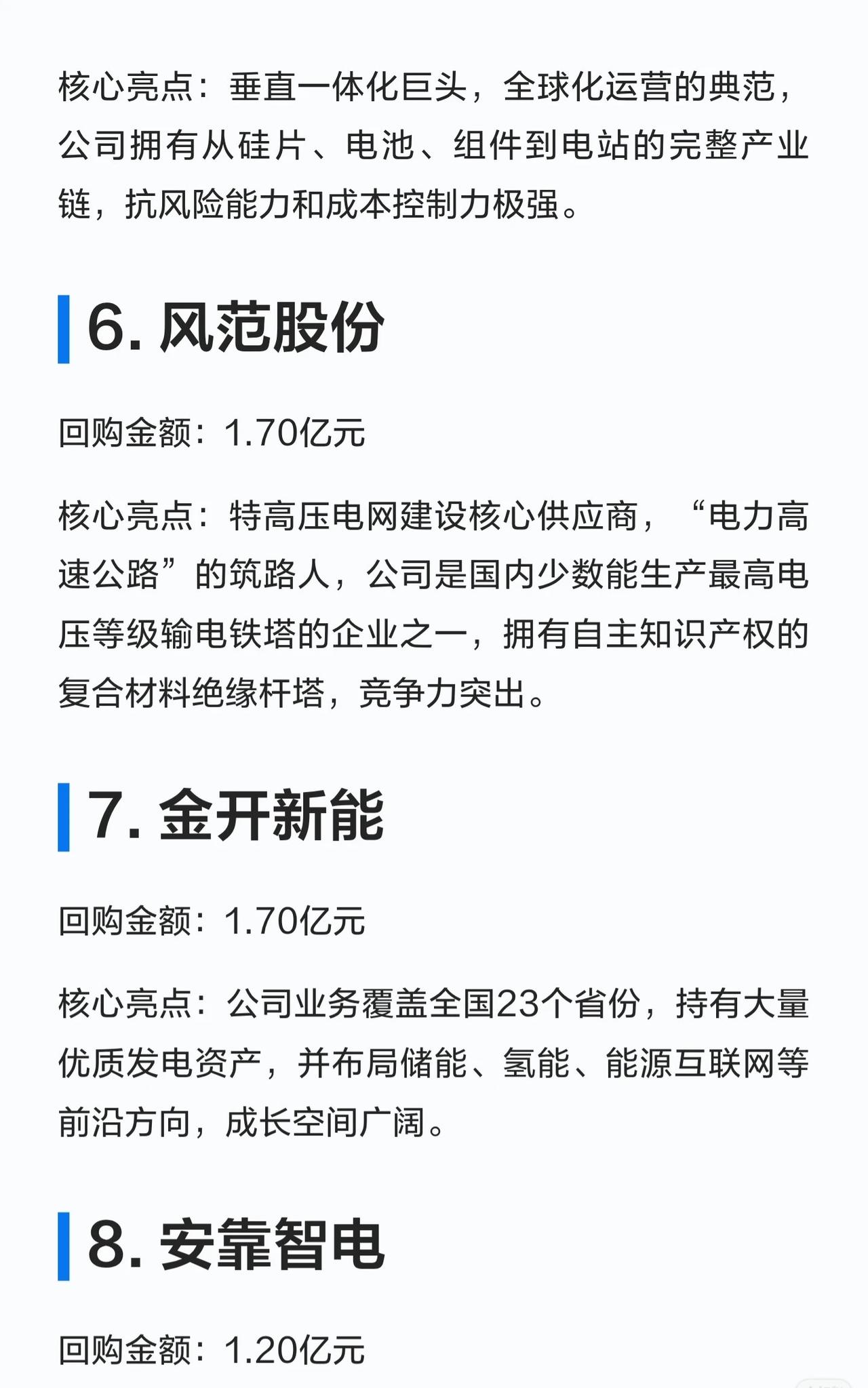 【电力产业链2026年回购金额TOP12公司】 1. 天合光能(10.01亿):全球光伏组件龙头,钙钛矿/硅叠层电池破纪录。 2. 中国核电(4.34亿):核电国家队,基荷能源压舱石,全产业链技术壁垒高。 3. 林洋能源(2.28亿):智能+储能+新能源三驱动智慧能源平台,布局电网、储能、N型光伏。 4. 华明装备(2.21亿):分接开关全球龙头,电网安全守护神,国内唯一双全产业链基地。 5. 晶澳科技(2.17亿):垂直一体化巨头,硅片至电站完整链,抗风险与成本优势强。 6. 风范股份(1.70亿):特高压核心供应商,输电铁塔与复合材料杆塔技术领先。 7. 金开新能(1.70亿):覆盖23省,持优质发电资产,布局储能、氢能、能源互联网。 8. 安靠智电(1.20亿):地下智能输电专家,GIL技术填补国际空白,提供整体解决方案。 9. 绿发电力(9275万):背靠中国绿发,早期新能源开发者,风电/光伏/光热/储能全面布局。 10. 安科瑞(9174万):微电网能效与安全方案商,构建“云-边-端”能源互联网生态。 11. 望变电气(6857万):核心材料到终端闭环,取向硅钢→变压器→运维一体化链条。 12. 欧陆通(6260万):电源领域老兵,专注开关电源,产品广泛用于电子、通信、家居等。 ——内容有价值,欢迎关注。