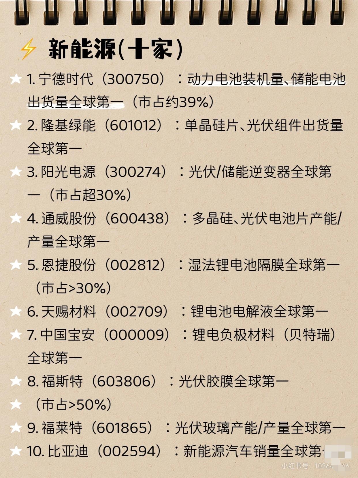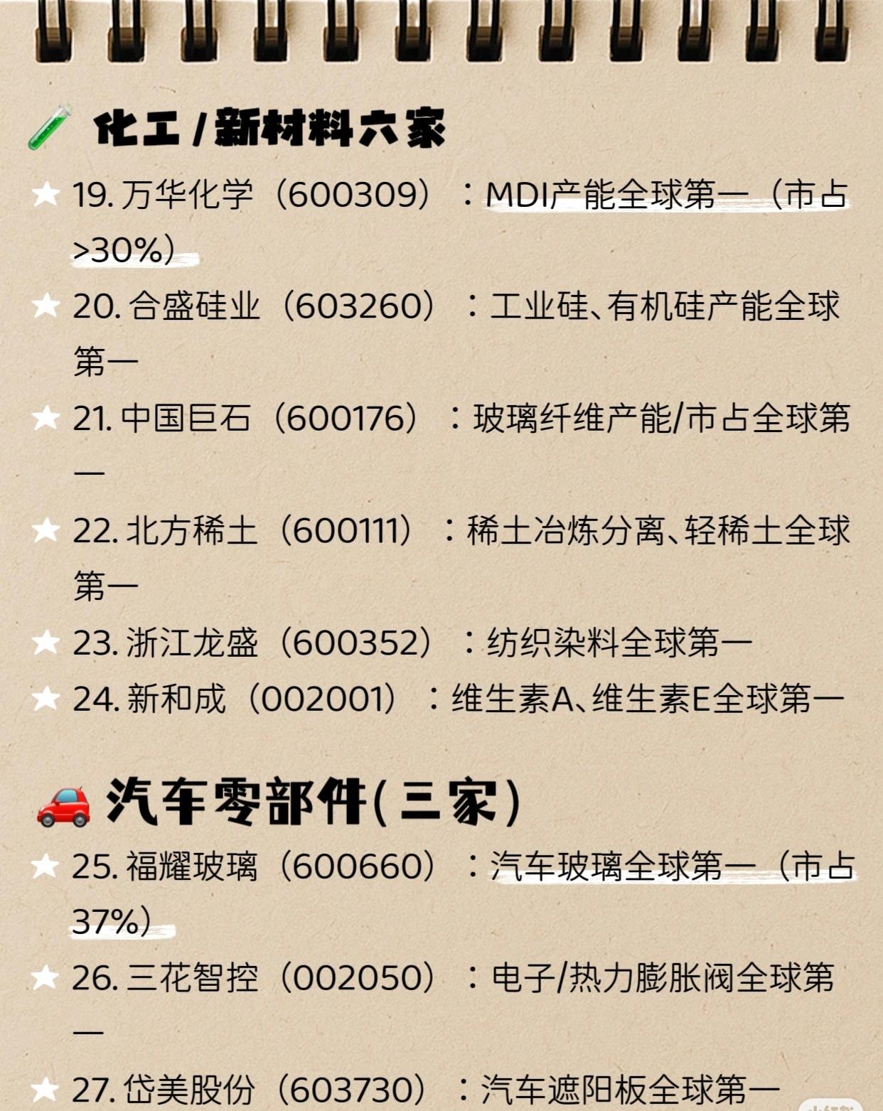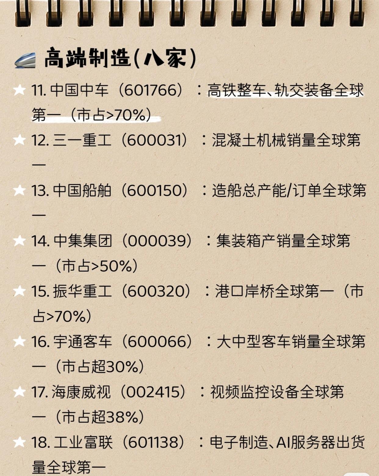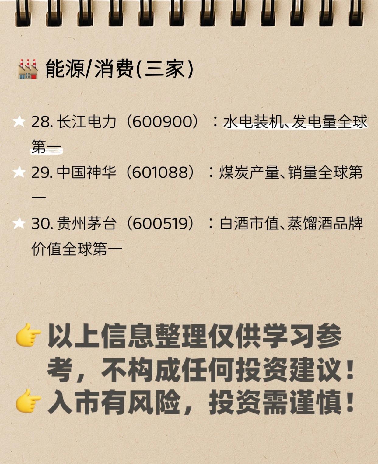 A股中的30个世界第一 (2026.3最新版),大家认同吗?欢迎评论 📈 新能源 (10家) * 宁德时代 (300750): 动力电池装机量、储能电池出货量全球第一 (市占约39%) * 隆基绿能 (601012): 单晶硅片、光伏组件出货量全球第一 * 阳光电源 (300274): 光伏/储能逆变器全球第一 (市占超30%) * 通威股份 (600438): 多晶硅、光伏电池片产能/产量全球第一 * 恩捷股份 (002812): 湿法锂电池隔膜全球第一 (市占>30%) * 天赐材料 (002709): 锂电池电解液全球第一 * 中国宝安 (000009): 锂电负极材料(贝特瑞)全球第一 * 福斯特 (603806): 光伏胶膜全球第一 (市占>50%) * 福莱特 (601865): 光伏玻璃产能/产量全球第一 * 比亚迪 (002594): 新能源汽车销量全球第一 🏭 高端制造 (8家) * 中国中车 (601766): 高铁整车、轨交装备全球第一 (市占>70%) * 三一重工 (600031): 混凝土机械销量全球第一 * 中国船舶 (600150): 造船总产能/订单全球第一 * 中集集团 (000039): 集装箱产销量全球第一 (市占>50%) * 振华重工 (600320): 港口岸桥全球第一 (市占>70%) * 宇通客车 (600066): 大中型客车销量全球第一 (市占超30%) * 海康威视 (002415): 视频监控设备全球第一 (市占超38%) * 工业富联 (601138): 电子制造、AI服务器出货量全球第一 🧪 化工/新材料 (6家) * 万华化学 (600309): MDI产能全球第一 (市占>30%) * 合盛硅业 (603260): 工业硅、有机硅产能全球第一 * 中国巨石 (600176): 玻璃纤维产能/市占全球第一 * 北方稀土 (600111): 稀土冶炼分离、轻稀土全球第一 * 浙江龙盛 (600352): 纺织染料全球第一 * 新和成 (002001): 维生素A、维生素E全球第一 🚗 汽车零部件 (3家) * 福耀玻璃 (600660): 汽车玻璃全球第一 (市占37%) * 三花智控 (002050): 电子/热力膨胀阀全球第一 * 岱美股份 (603730): 汽车遮阳板全球第一 🏭 能源/消费 (3家) * 长江电力 (600900): 水电装机、发电量全球第一 * 中国神华 (601088): 煤炭产量、销量全球第一 * 贵州茅台 (600519): 白酒市值、蒸馏酒品牌价值全球第一 ⚠️ 免责声明: 以上信息整理仅供学习参考,不构成任何投资建议!入市有风险,投资需谨慎!