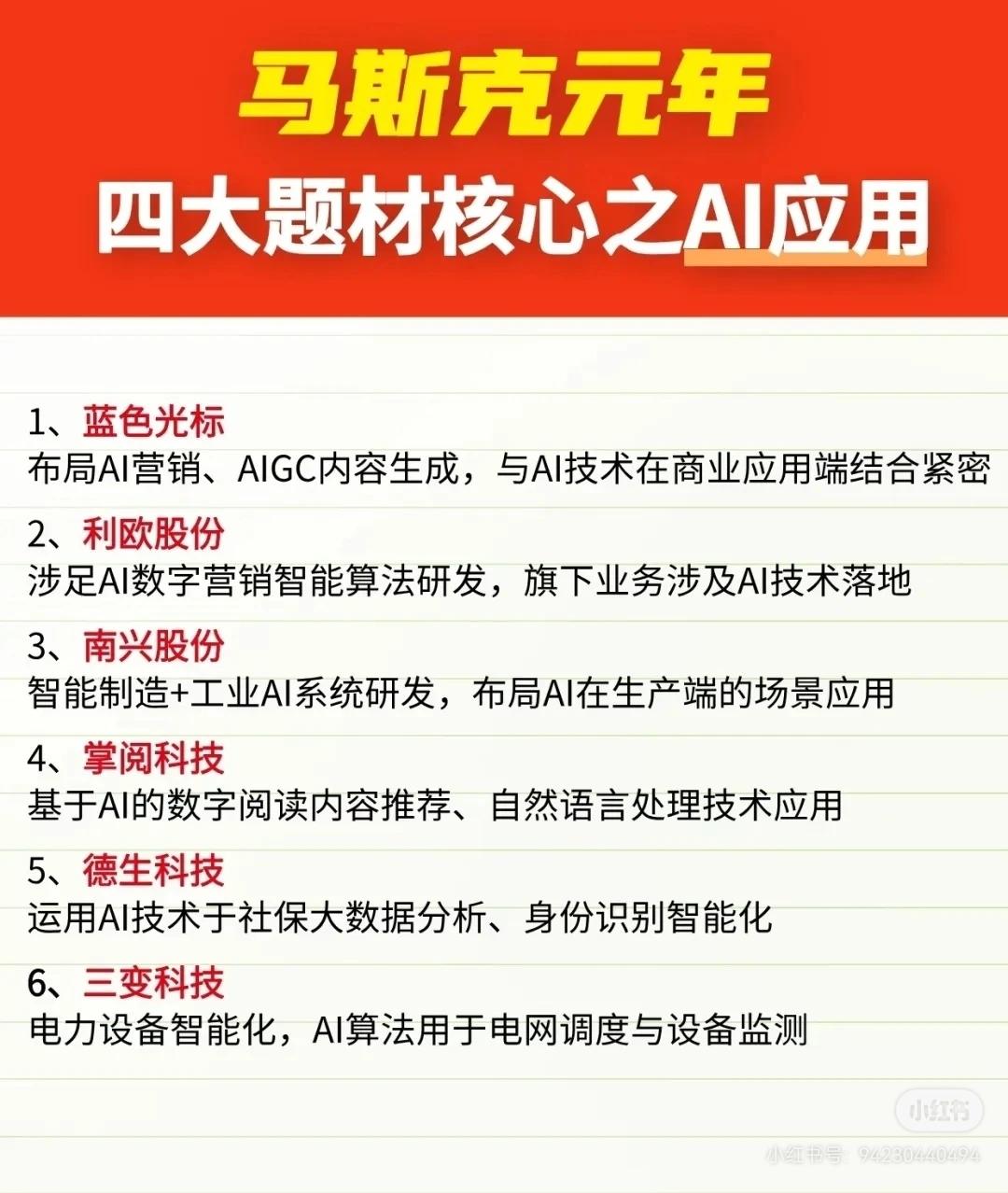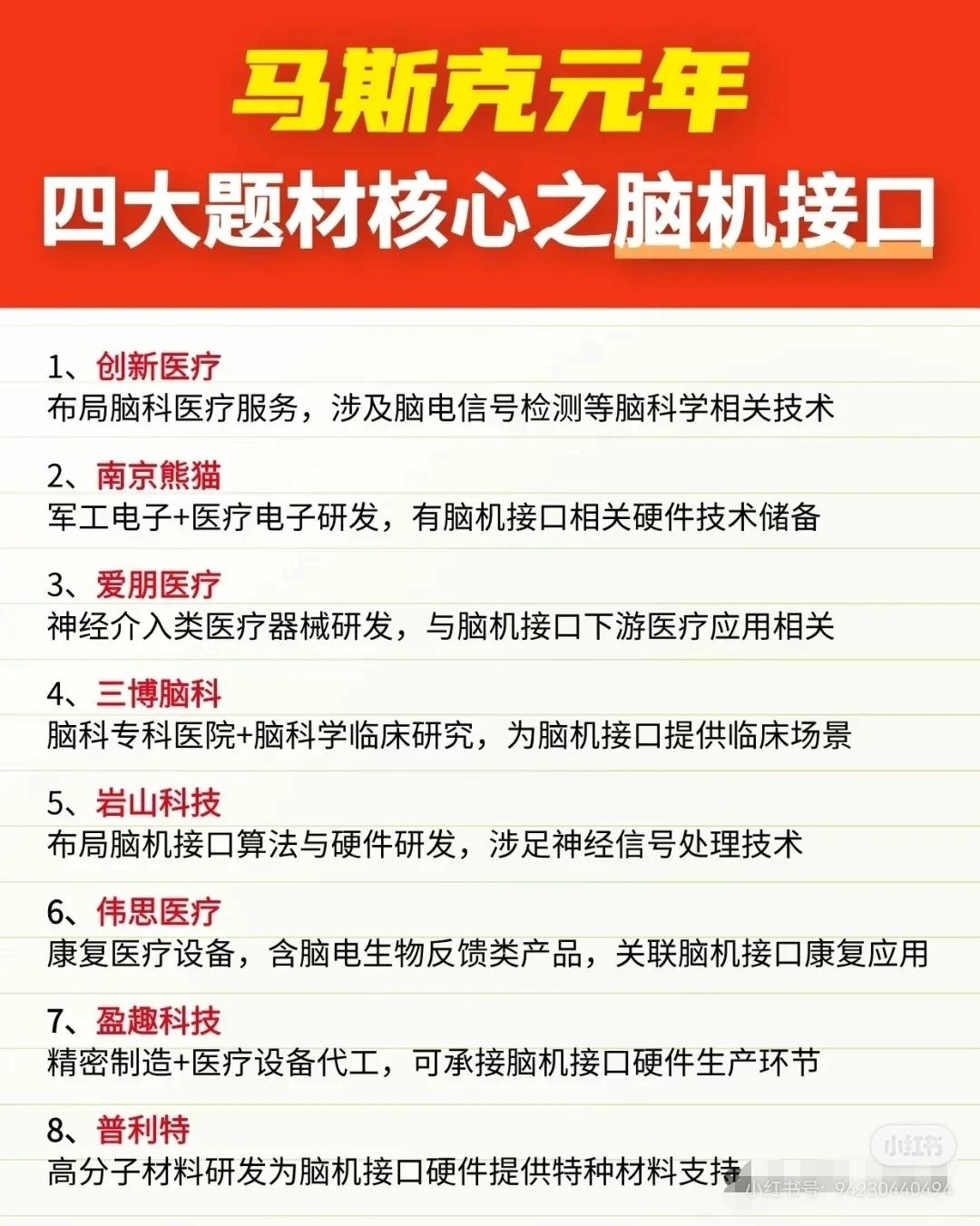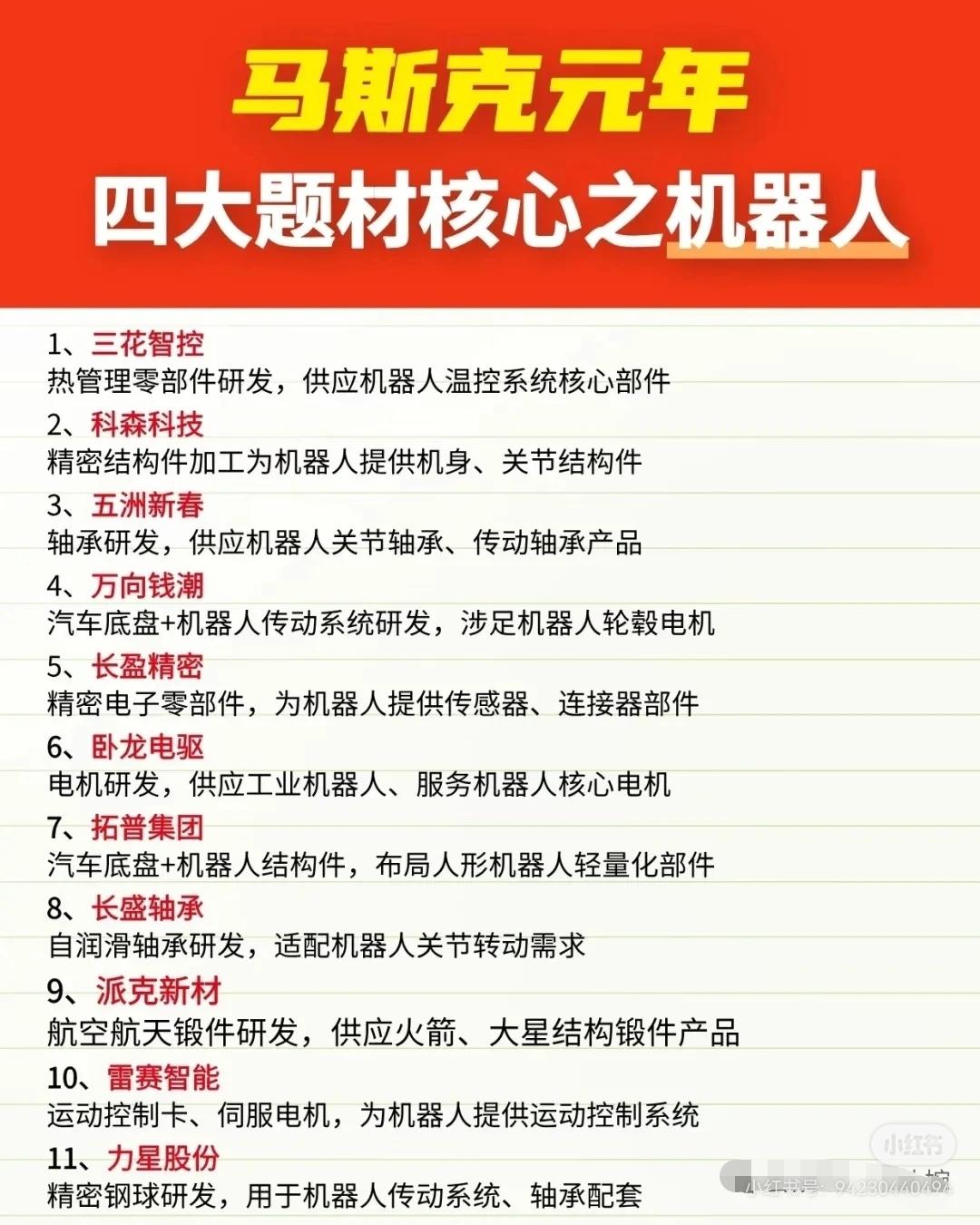 四大题材核心标的,大家认同吗? 一、商业航天 1. 再升科技:航空航天过滤/隔热材料,配套航天设备 2. 通宇通讯:卫星通信天线,布局低轨卫星通信设备 3. 信维通讯:射频元器件,为卫星终端供天线、连接器 4. 航天发展:航天军工电子、卫星导航配套,涉系统集成 5. 中国卫星:卫星研产销,国内商业航天核心标的 6. 雷科防务:卫星导航定位、雷达,配套航天测控系统 7. 西部材料:钛合金等稀有金属,用于航天器结构件 8. 普拓股份:航天航空精密零部件加工,承接配套订单 9. 派克新材:航空航天锻件,供火箭、大星结构锻件 二、脑机接口 1. 创新医疗:脑科医疗服务,涉脑电信号检测等脑科学技术 2. 南京熊猫:军工+医疗电子研发,有脑机接口硬件技术储备 3. 爱朋医疗:神经介入医疗器械,关联脑机接口下游医疗应用 4. 三博脑科:脑科专科医院+临床研究,提供脑机接口临床场景 5. 岩山科技:布局脑机接口算法与硬件,涉神经信号处理 6. 伟思医疗:康复医疗设备(含脑电生物反馈),关联康复应用 7. 盈趣科技:精密制造+医疗设备代工,承接脑机接口硬件生产 8. 普利特:高分子材料,为脑机接口硬件提供特种材料支持 三、机器人 1. 三花智控:热管理零部件,供机器人温控核心部件 2. 科森科技:精密结构件,为机器人供机身、关节结构件 3. 五洲新春:轴承研发,供机器人关节/传动轴承 4. 万向钱潮:汽车底盘+机器人传动系统,涉机器人轮毂电机 5. 长盈精密:精密电子零部件,为机器人供传感器、连接器 6. 卧龙电驱:电机研发,供工业/服务机器人核心电机 7. 拓普集团:汽车底盘+机器人结构件,布局人形机器人轻量化部件 8. 长盛轴承:自润滑轴承,适配机器人关节转动 9. 派克新材:航空航天锻件,供火箭、大星结构锻件 10. 雷赛智能:运动控制卡、伺服电机,供机器人运动控制系统 11. 力星股份:精密钢球,用于机器人传动、轴承配套 四、AI应用 1. 蓝色光标:AI营销、AIGC内容生成,AI商业应用结合紧密 2. 利欧股份:AI数字营销智能算法,业务涉AI技术落地 3. 南兴股份:智能制造+工业AI系统,布局AI生产端场景 4. 掌阅科技:AI数字阅读推荐、自然语言处理技术应用 5. 德生科技:AI用于社保大数据分析、身份识别智能化 6. 三变科技:电力设备智能化,AI算法用于电网调度与设备监测