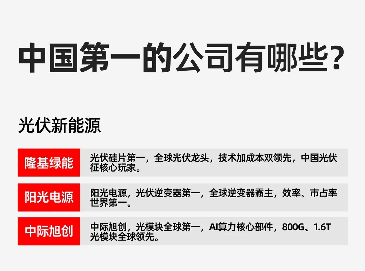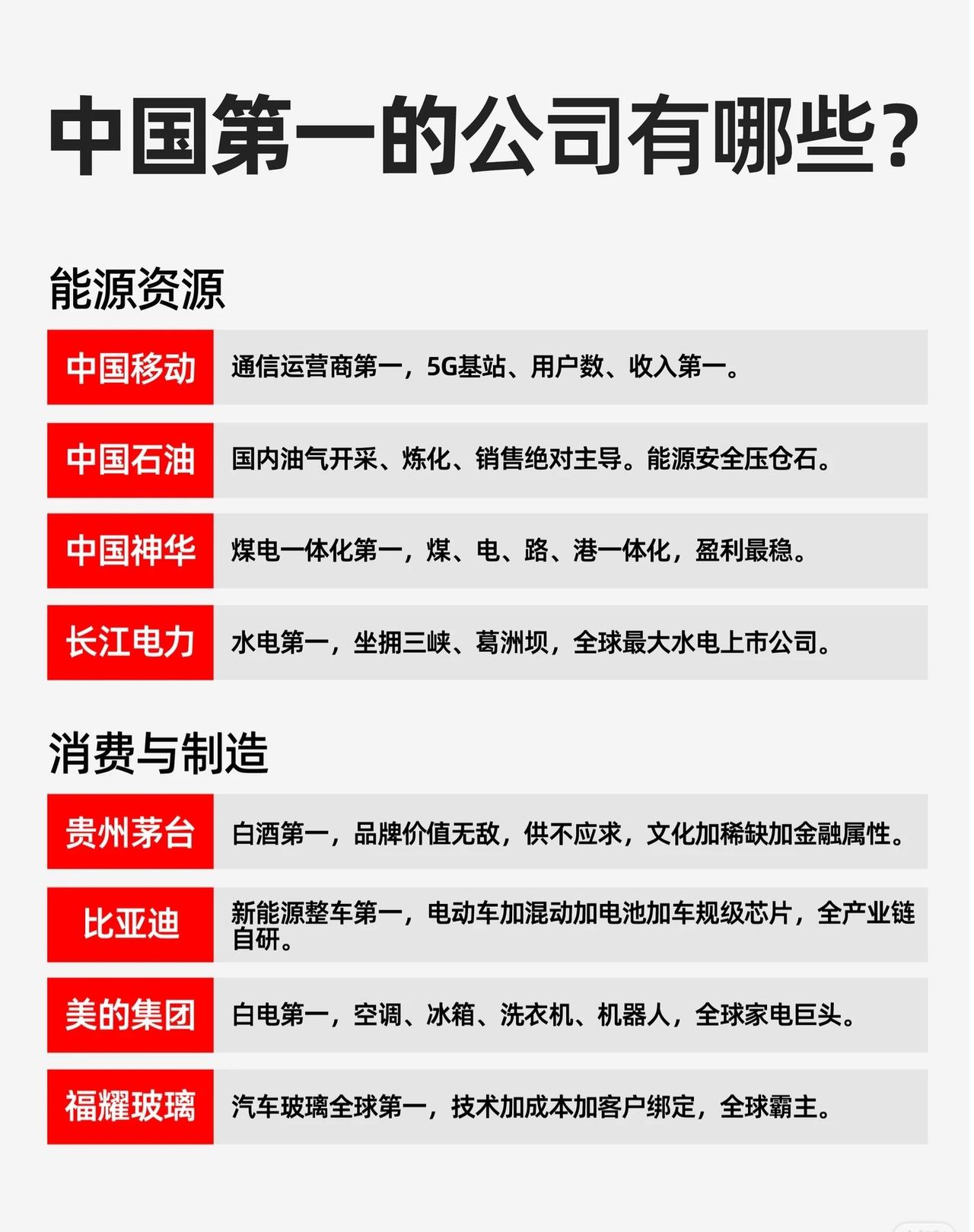 不同行业中被称为“中国第一”的公司,大家认同吗? 欢迎评论 金融圈 * 工商银行:全球银行一哥,资产、利润、网点、客户数全球第一。 * 中国平安:综合金融老大,保险、银行、理财、科技全打通。 * 中信证券:券商圈一哥,投行、资管、研究综合实力第一。 科技制造 * 中芯国际:国产芯片制造第一,最先进精元代工。 * 中兴通讯:通讯设备国内第一,5G基站、核心网、算力设备全球TOP级。 * 海康威视:全球监控第一,安防界绝对霸主。 * 宁德时代:全球动力电池第一,市占率遥遥领先。 * 工业富联:全球代工制造第一,苹果产业链龙头。 能源资源 * 中国移动:通信运营商第一,5G基站、用户数、收入第一。 * 中国石油:国内油气开采、炼化、销售绝对主导。 * 中国神华:煤电一体化第一,煤电路港一体化,盈利最稳。 * 长江电力:水电第一,全球最大水电上市公司(坐拥三峡、葛洲坝)。 消费与制造 * 贵州茅台:白酒第一,品牌价值无敌,文化+稀缺+金融属性。 * 比亚迪:新能源整车第一,电动车+混动+电池+车规级芯片全产业链自研。 * 美的集团:白电第一,空调、冰箱、洗衣机、机器人,全球家电巨头。 * 福耀玻璃:汽车玻璃全球第一,技术+成本+客户绑定,全球霸主。 光伏新能源 * 隆基绿能:光伏硅片第一,全球光伏龙头,技术+成本双领先。 * 阳光电源:光伏逆变器第一,全球逆变器霸主,效率、市占率世界第一。 * 中际旭创:光模块全球第一,AI算力核心部件,800G、1.6T光模块全球领先。