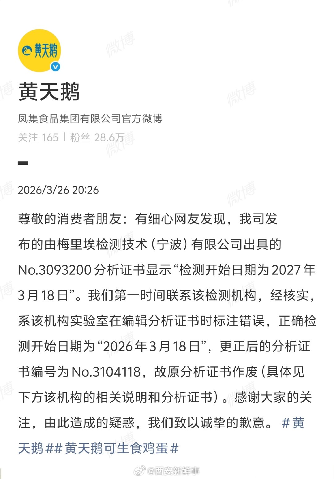 【黄天鹅回应分析证书时间标注错误】黄天鹅晒分析证书3月26日,再发文致歉:有细心网友发现,我司发布的由梅里埃检测技术(宁波)有限公司出具的No.3093200分析证书显示“检测开始日期为2027年3月18日”。我们第一时间联系该检测机构,经核实,系该机构实验室在编辑分析证书时标注错误,正确检测开始日期为“2026年3月18日”,更正后的分析证书编号为No.3104118,故原分析证书作废(具体见下方该机构的相关说明和分析证书)。感谢大家的关注,由此造成的疑惑,我们致以诚挚的歉意。