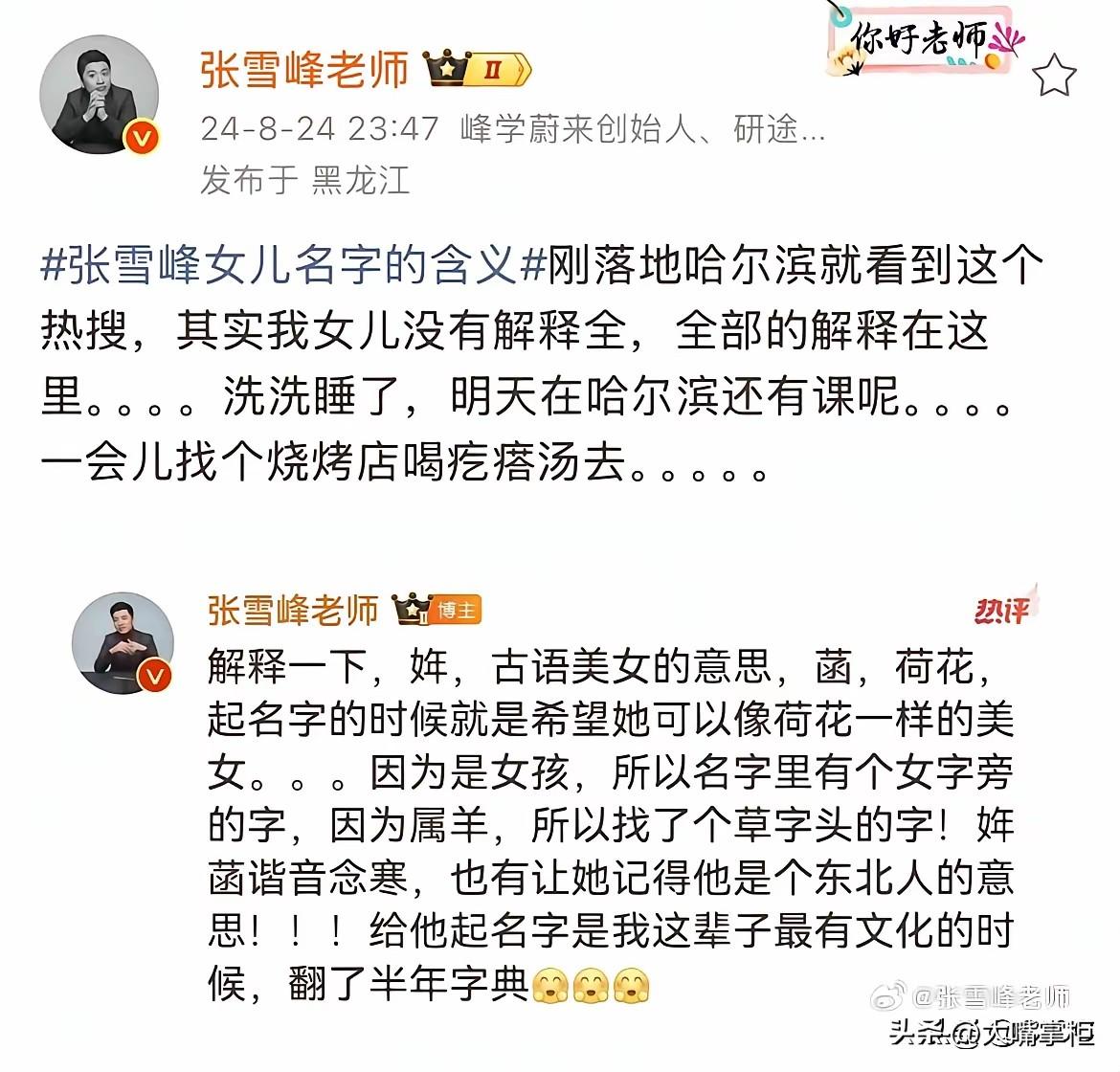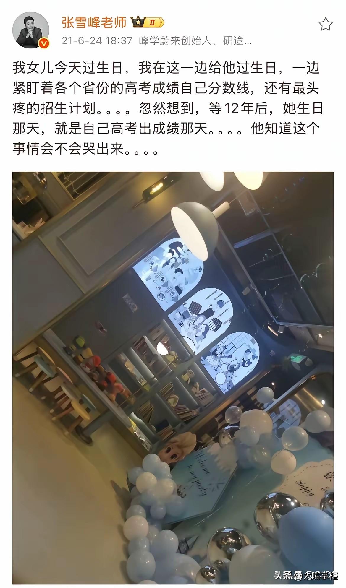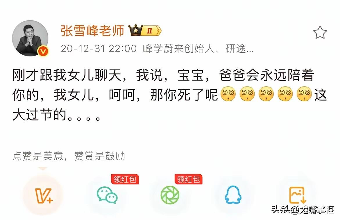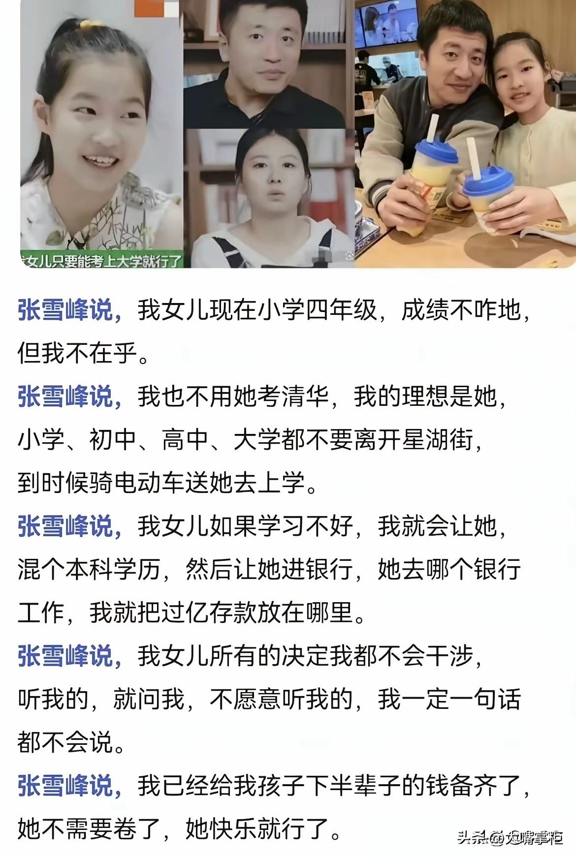 张雪峰的女儿说:我爸爸很伟大,他们说天上的文曲星换届了,选中了爸爸。谁能想到, 这句话是从一个10岁的小姑娘嘴里说出的。 3月26日,张雪峰走后两天,女儿张姩菡出现在主持人陈南的评论区,留下了这句话。 小姑娘的豁达和沉稳,让很多大人都自叹不如,别的不说,能说出这句话,张姩菡已经有比较豁达的心理接受张雪峰的离去,虽然不舍,虽然心痛,但知道爸爸有更好的去处,也就释然了。 翻看张雪峰以往的关于女儿的内容,只能说父女俩的缘份,是一场双向奔赴。 作为大忙人,张雪峰尽量给女儿足够的爱,从名字的苦思苦思冥想,到每一年的生日都陪伴在侧,,再到去世前每天都骑着小电瓶去接送张姩菡上下学。点点滴滴,他都想把最好的留给张姩菡,这也构成了父女间最美好的回忆。 对女儿的未来,张雪峰早有规划,不管是女儿想进银行,还是只做一个普普通通的女人,张雪峰都做好了托底的准备,不会让张姩菡受一点苦,他只想宠着她,希望她拥有最理想的人生。 只是生命无常,张雪峰突然离去,让父女俩的缘分只持续了10年就戛然而止了,但这10年,对张姩菡来说,已经享受了最浓的父爱,这些爱,足够她以后独自走自己的路。